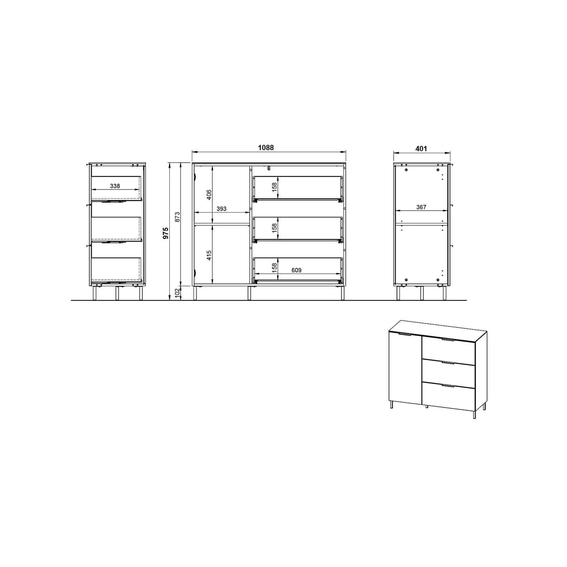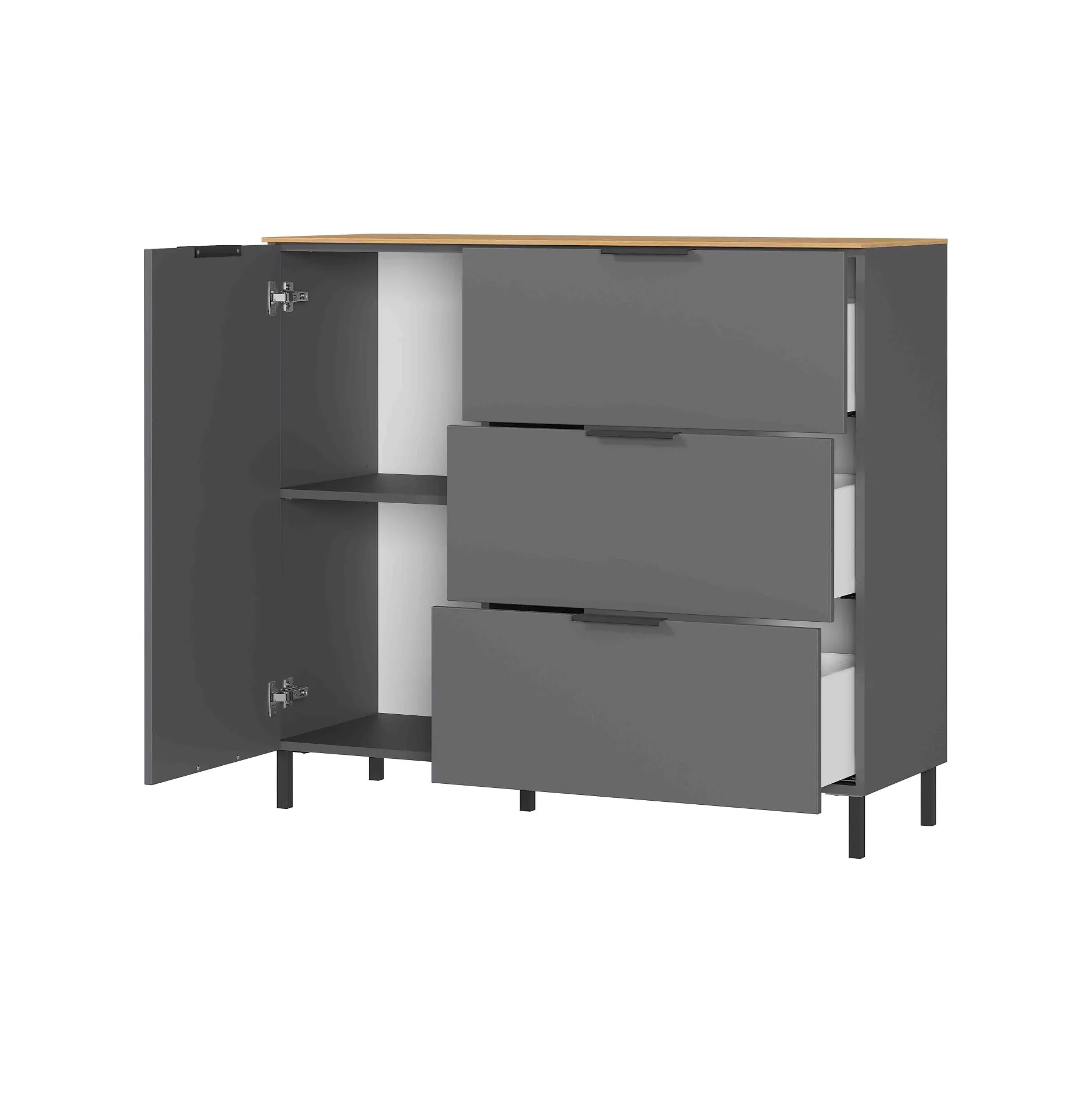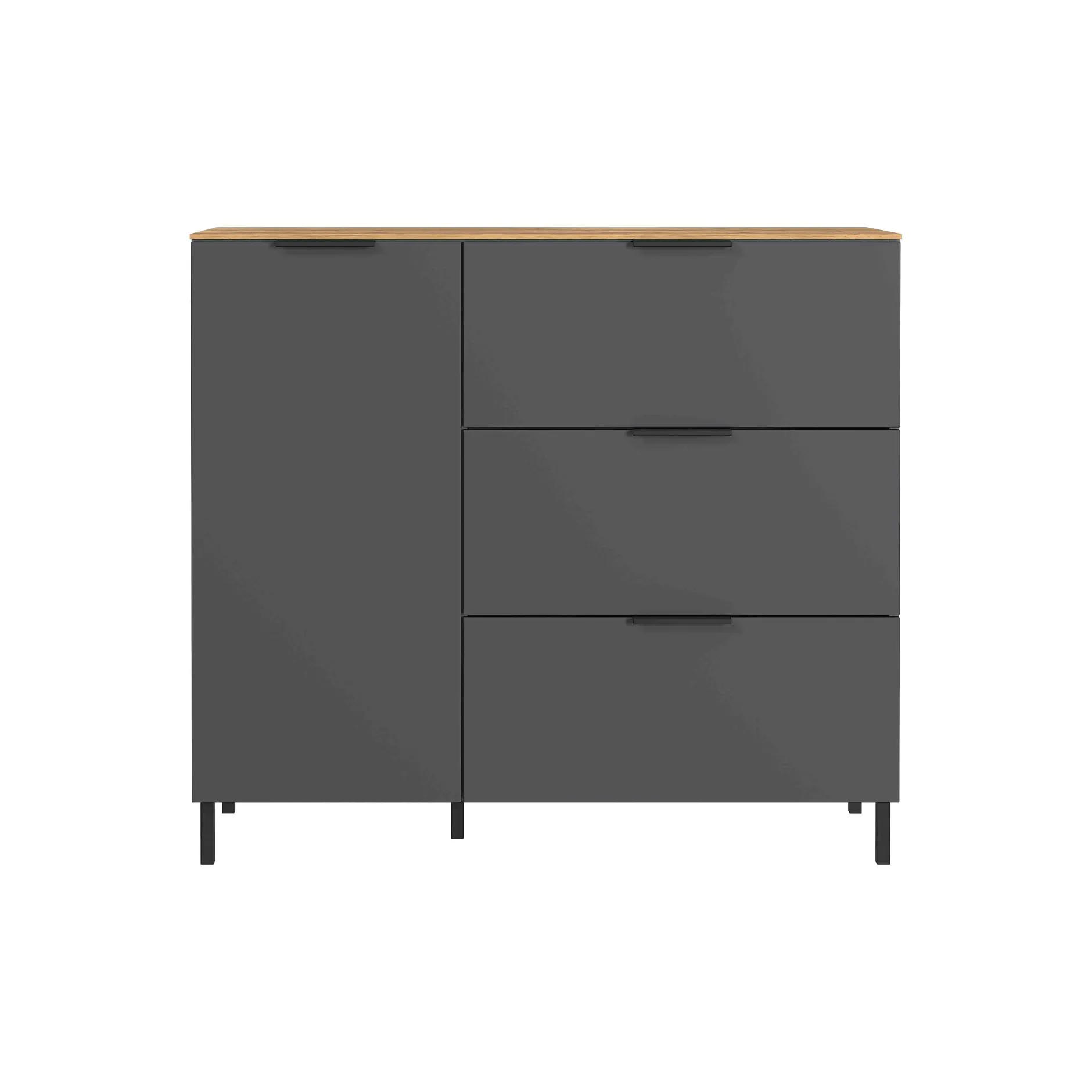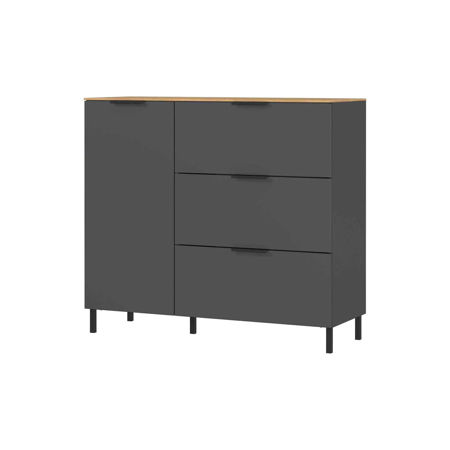Deze kast is zo’n typische kast om in je kamer erbij te zetten voor wat extra bergruimte. Achter de deur links ligt nog een legplank, daarnaast zijn 3 ruime en soepel lopende laden. Het meubel wordt geleverd met zowel de hoge als de lage pootjes.