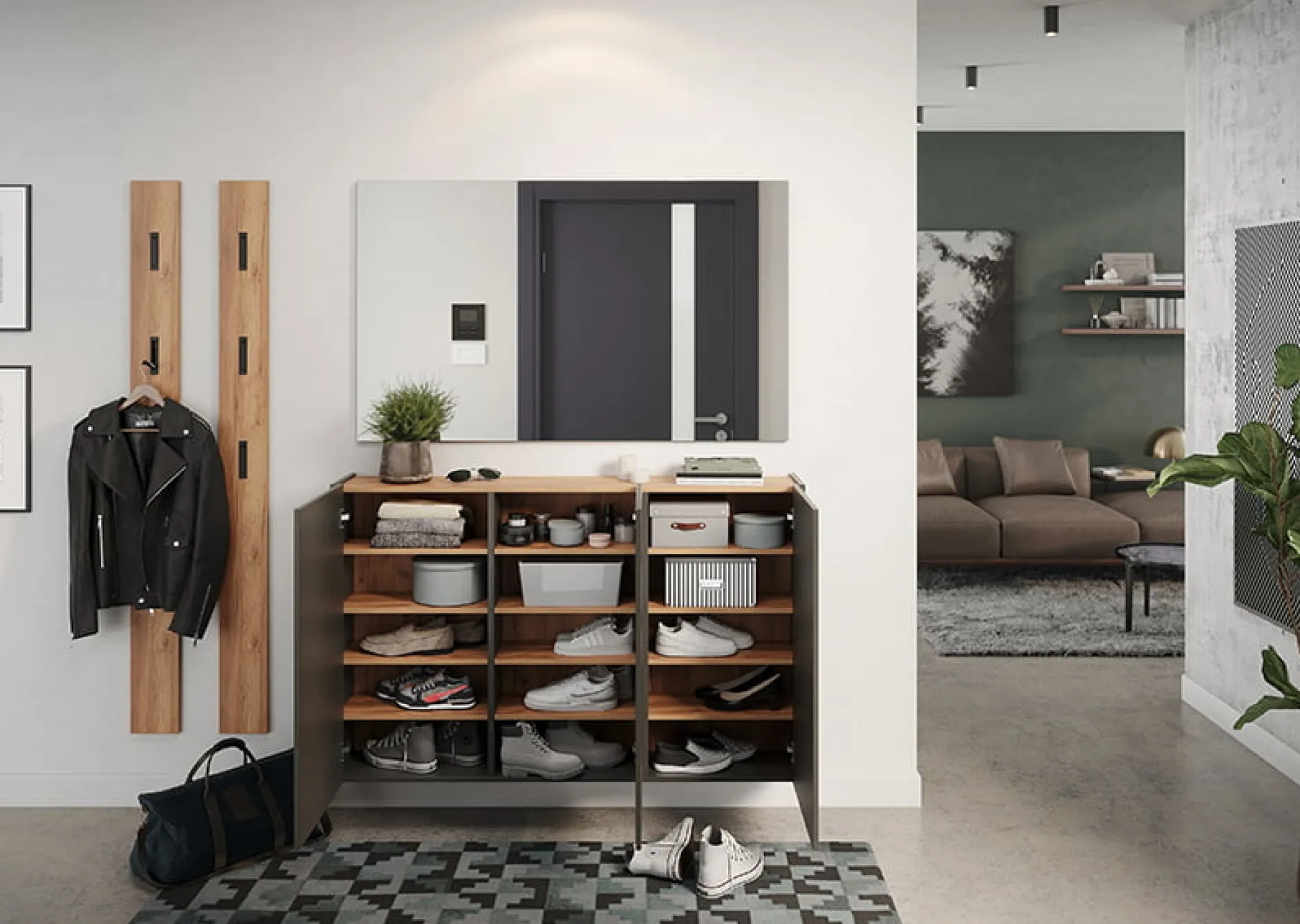 De veelzijdige opbergkast Aniek biedt met drie deuren ruime opbergruimte. De kast bevat 9 verstelbare en 3 vaste planken, elk belastbaar tot 10 kg. De bovenste plank, planken en achterpaneel hebben een Navarra eiken afwerking, terwijl de rest van de kast grafiet is. Het greeploze design en de kras- en impactbestendige coating maken deze kast ideaal voor dagelijks gebruik. Bovendien is de ondiepe diepte perfect voor smalle gangen.