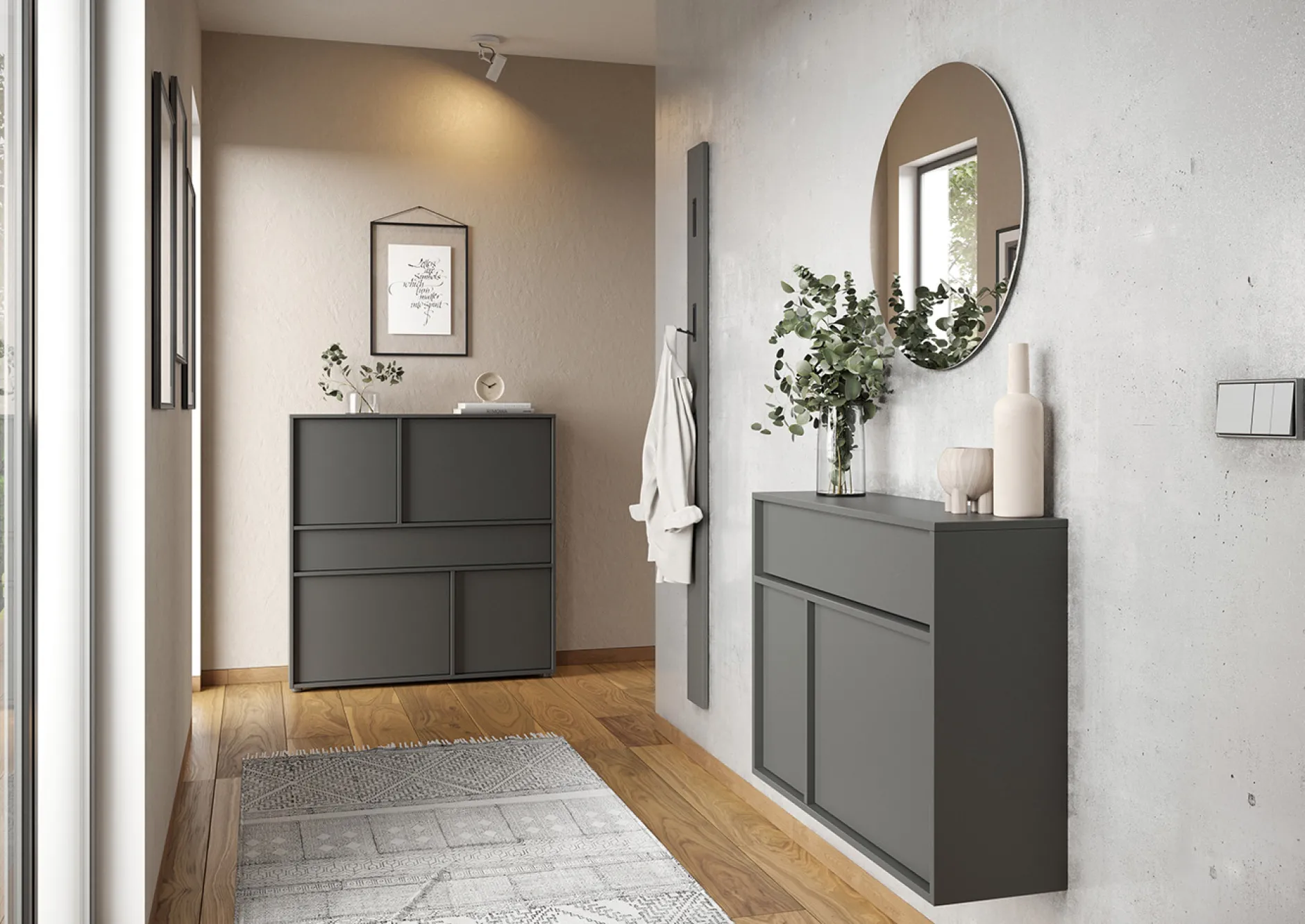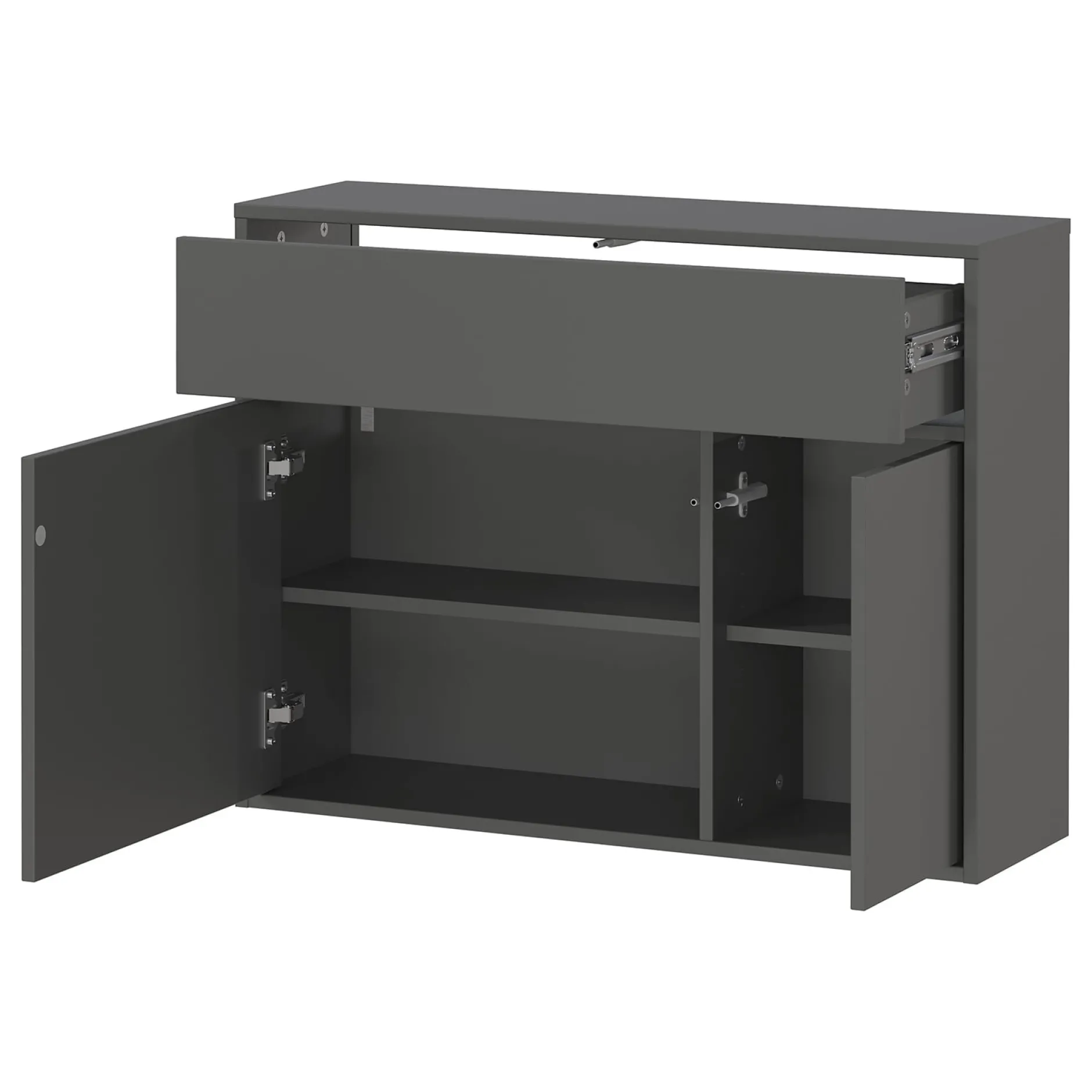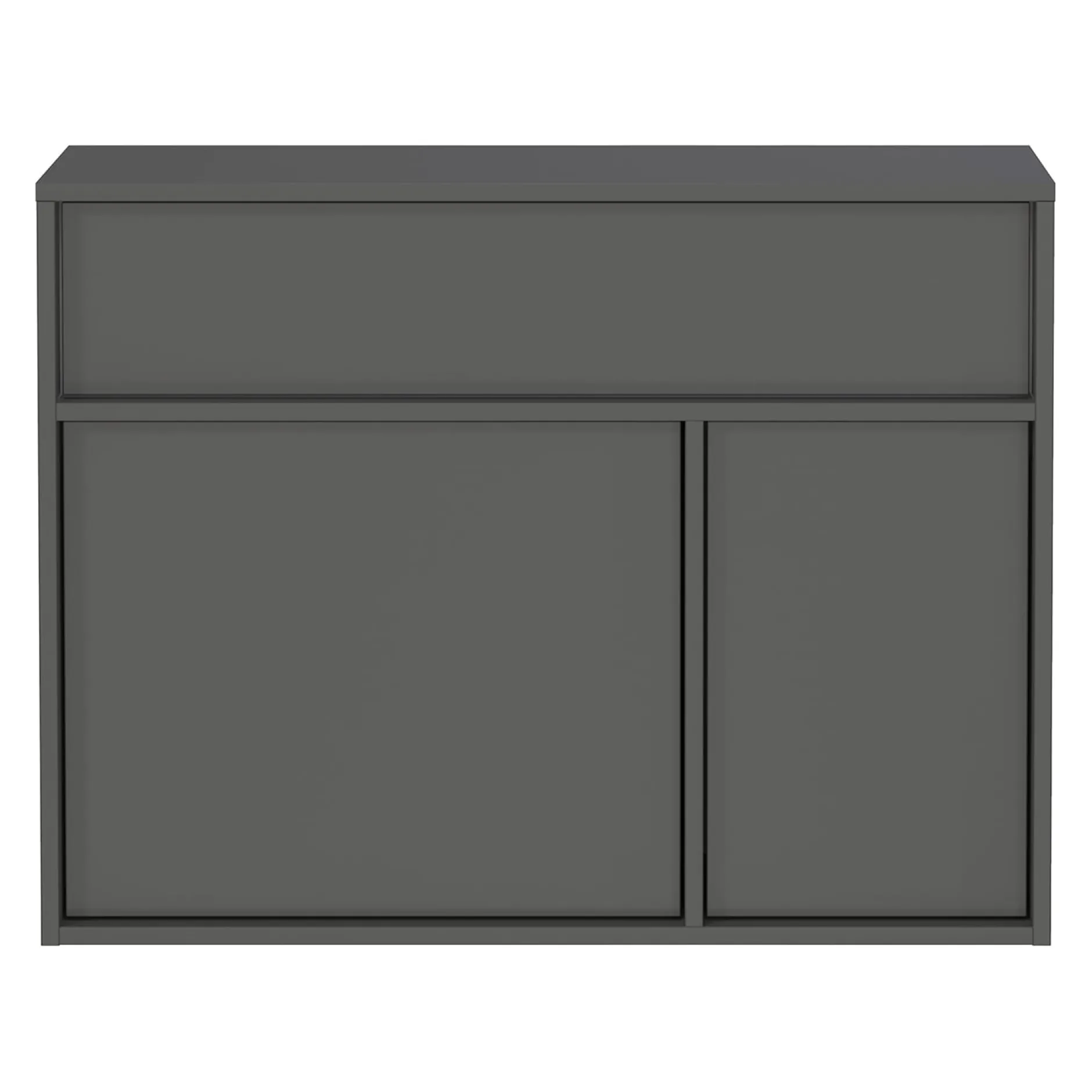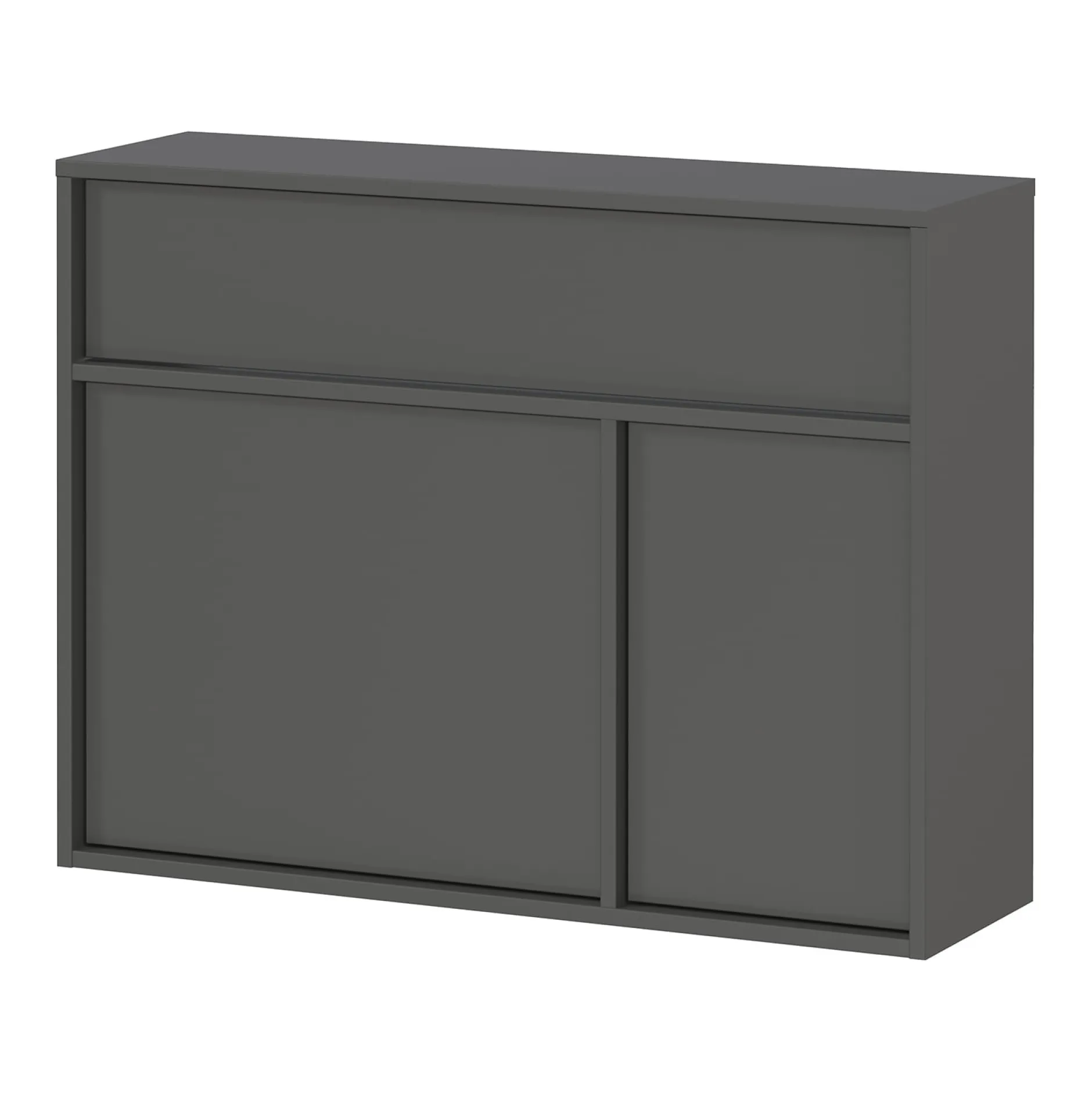 De opbergkast Mathieu (82 cm) biedt een veelzijdige oplossing voor elk interieur. Deze kast beschikt over één lade met een draagvermogen tot 10 kg en twee deuren met daarachter 2 planken, elk belastbaar tot 5 kg. Het bovenblad en de planken hebben een grafietkleurige afwerking, wat de kast een moderne uitstraling geeft. Dankzij de krasbestendige en slijtvaste melamineharscoating is de kast ideaal voor dagelijks gebruik. De ondiepe diepte maakt hem perfect voor smalle gangen.