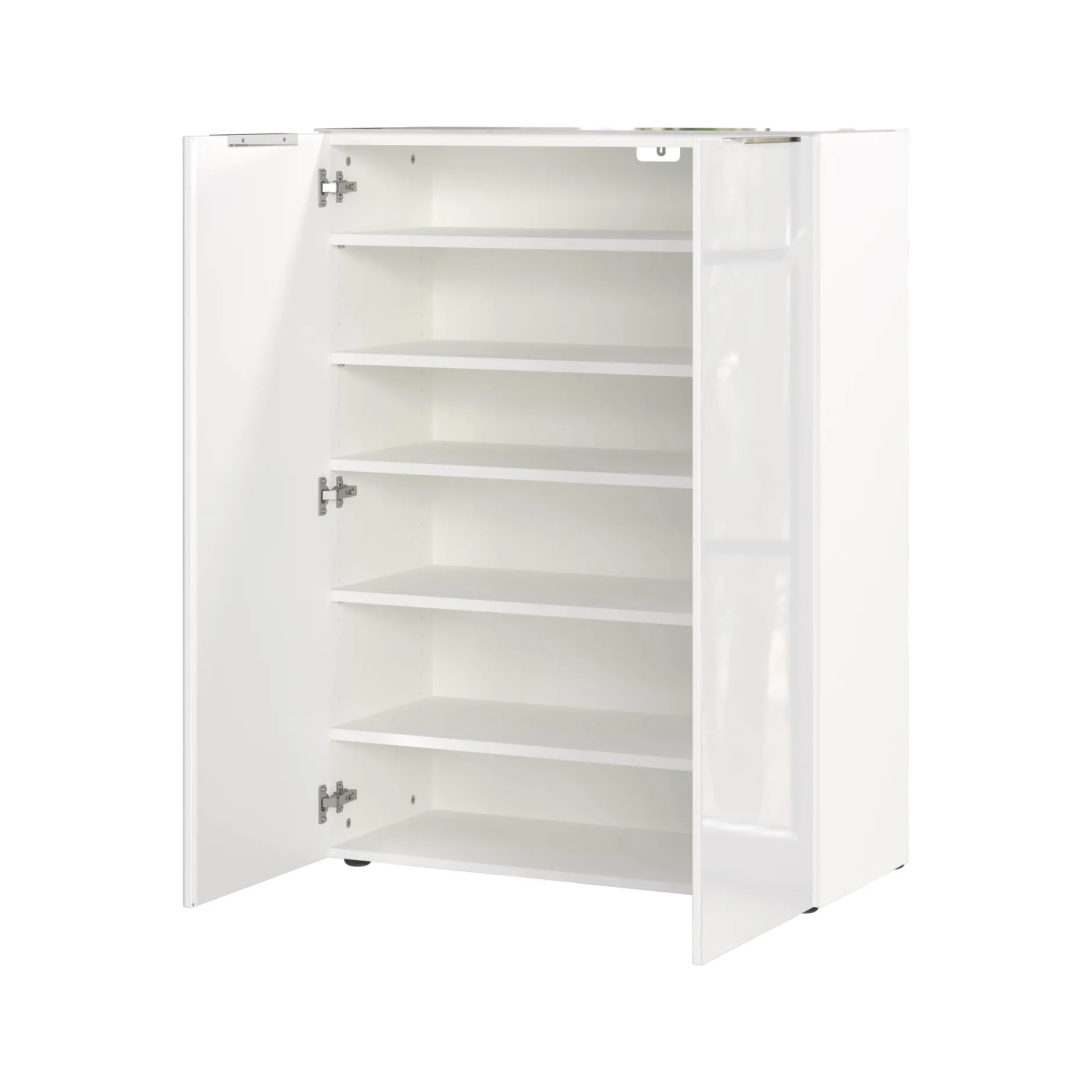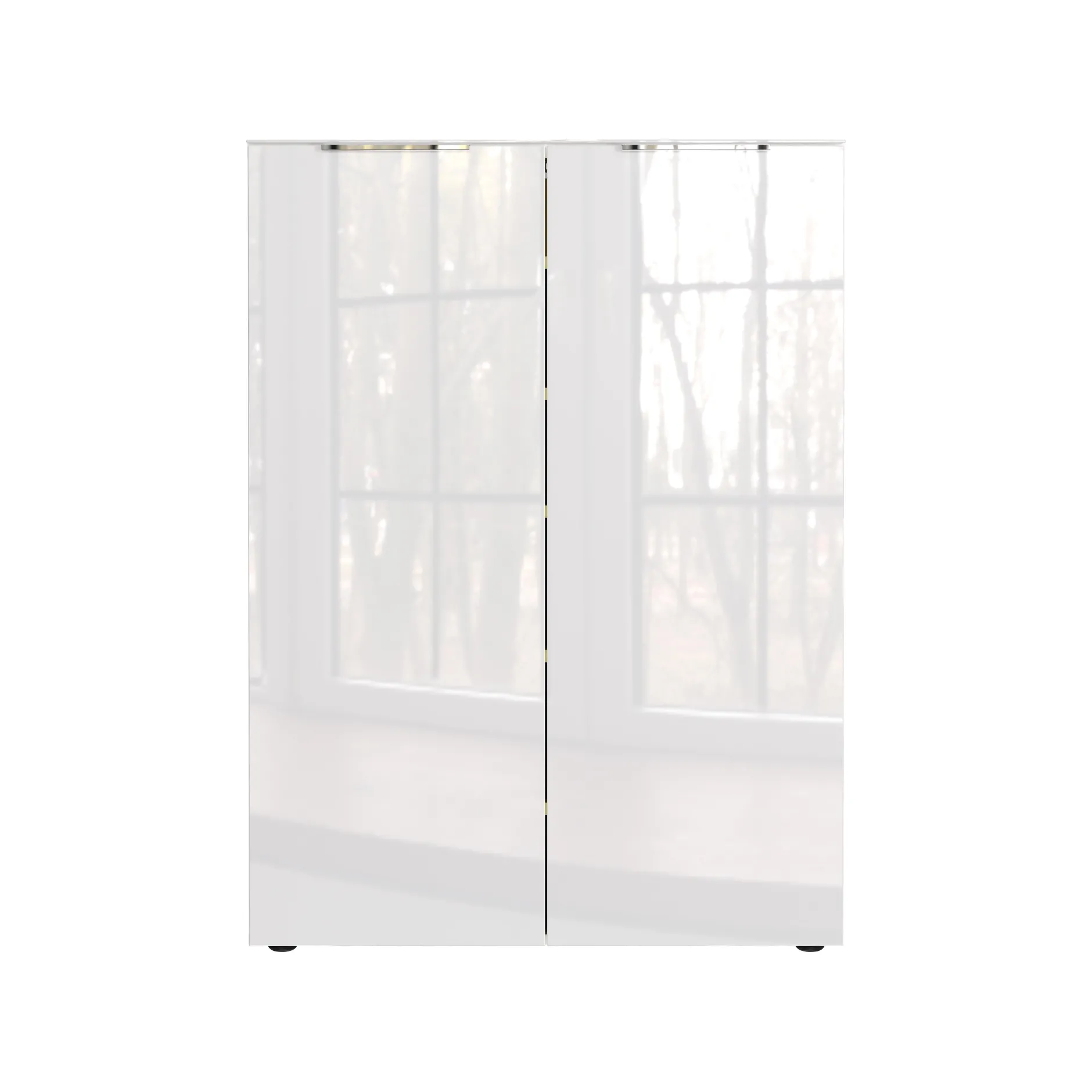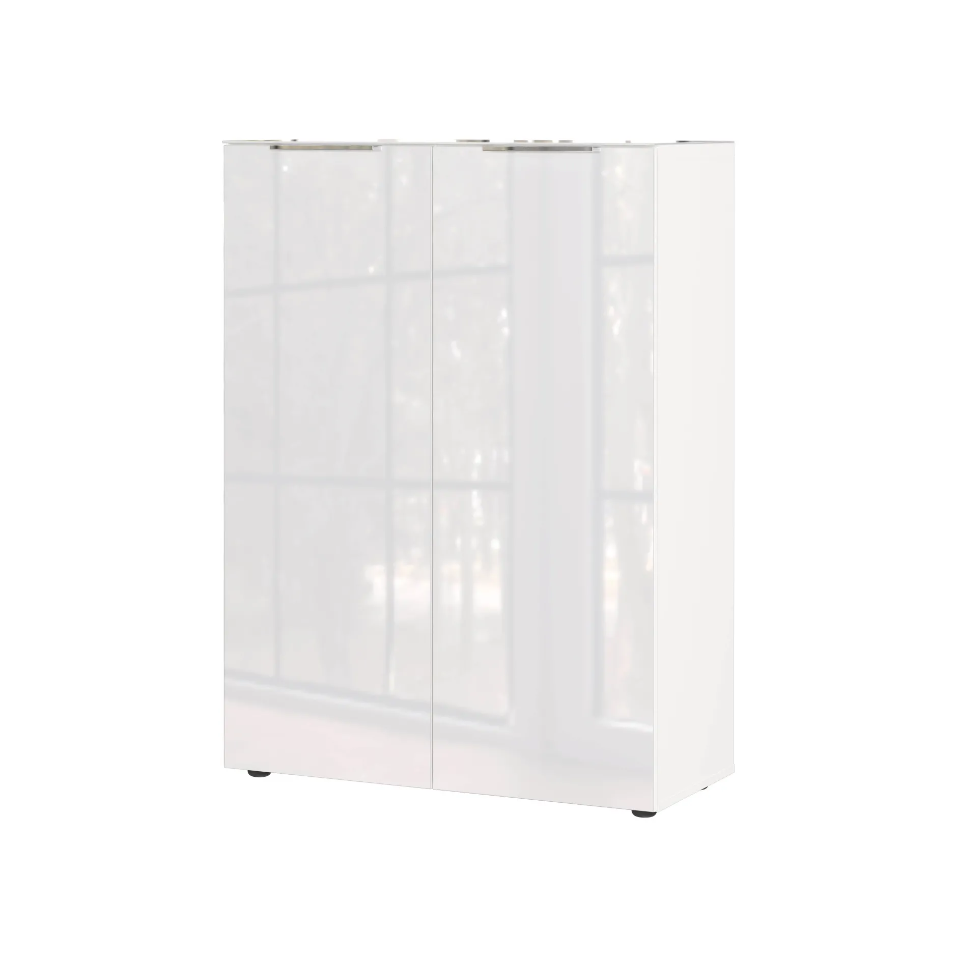 De opbergkast Montreal Wit 120 cm is een stijlvolle en praktische opbergoplossing met een moderne glasfront afwerking. De kast biedt ruimte voor maximaal 20 paar schoenen en heeft een vast legbord dat tot 20 kg kan dragen, plus vier verstelbare legborden met een draagvermogen van 10 kg per stuk. De krasbestendige melamine coating en de metalen randgrepen in mat zilver geven het meubel een strakke uitstraling.