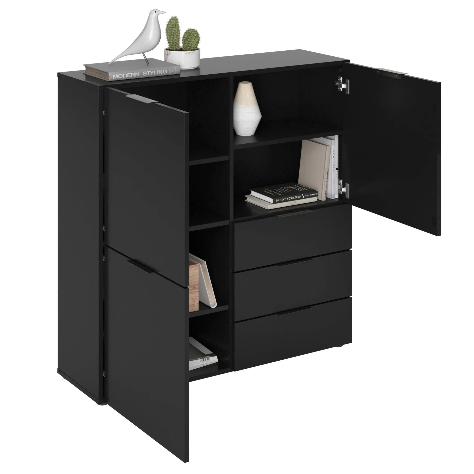 De donkere collectie Raven is helemaal van deze tijd met zijn strakke design en matte zwarte afwerking. Hierdoor zijn deze meubels ook erg makkelijk te combineren met de rest van uw interieur. De meubels zijn gemaakt van spaanplaat met een melamine toplaag. De meubels passen mooi in een woonkamer, maar ook in bijvoorbeeld een studeerkamer of kantoor.