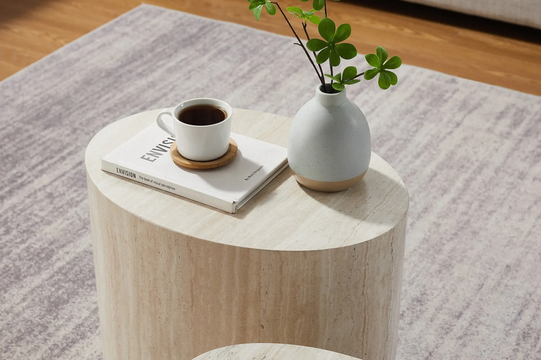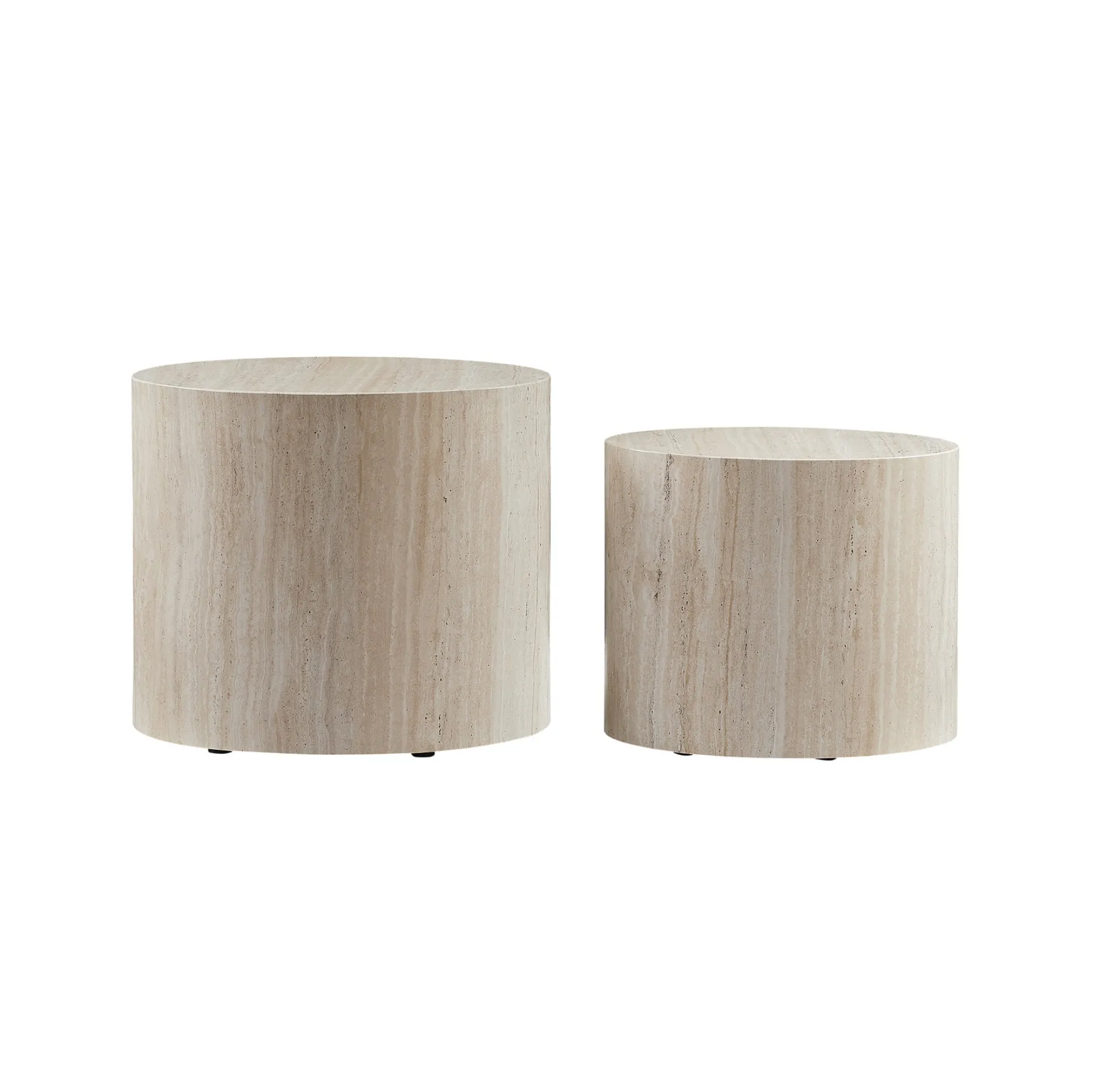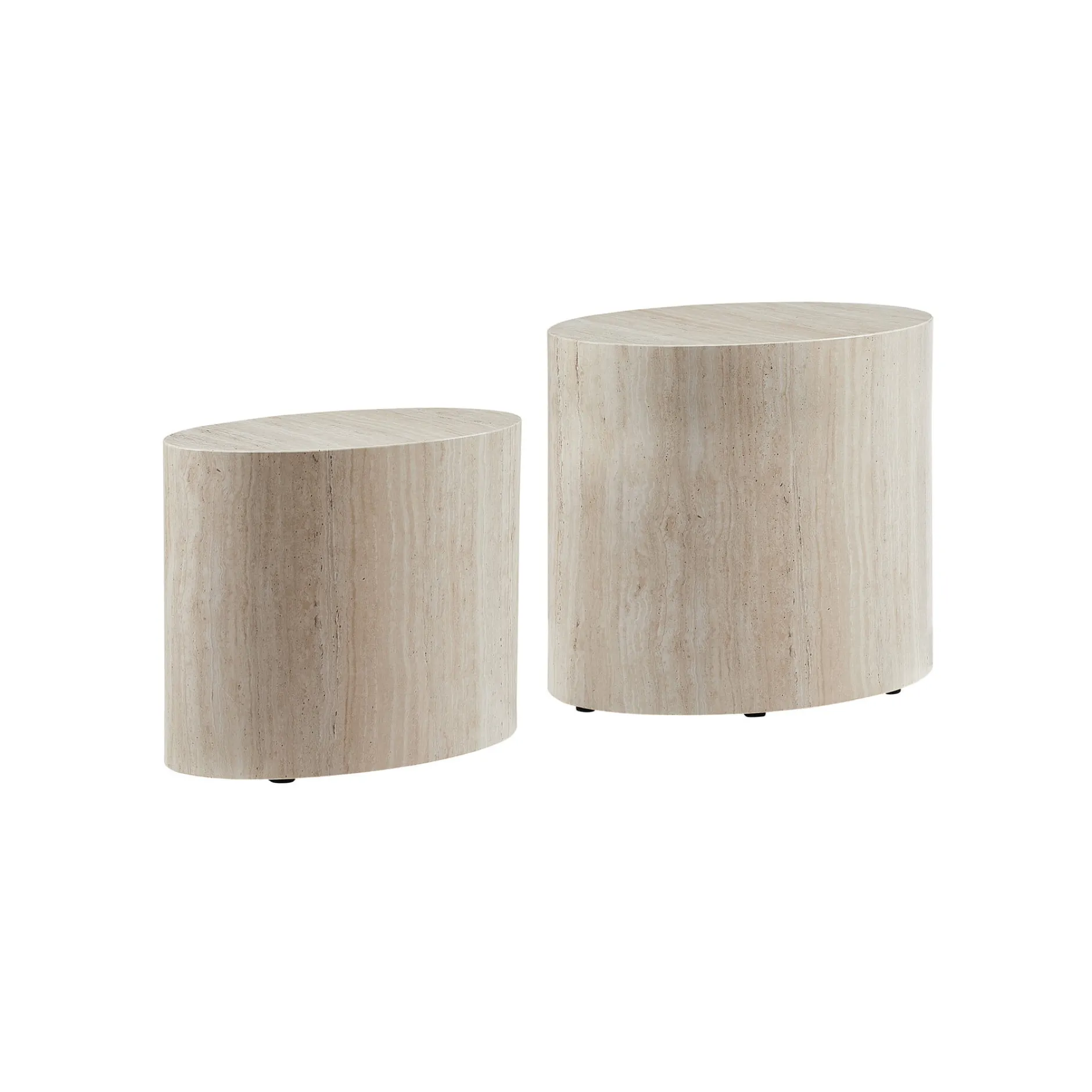 Deze moderne set van 2 salontafels in travertinlook combineert stijl en functionaliteit. Dankzij de holle binnenruimte zijn de tafels licht en eenvoudig te verplaatsen. Perfect om samen of apart te gebruiken.