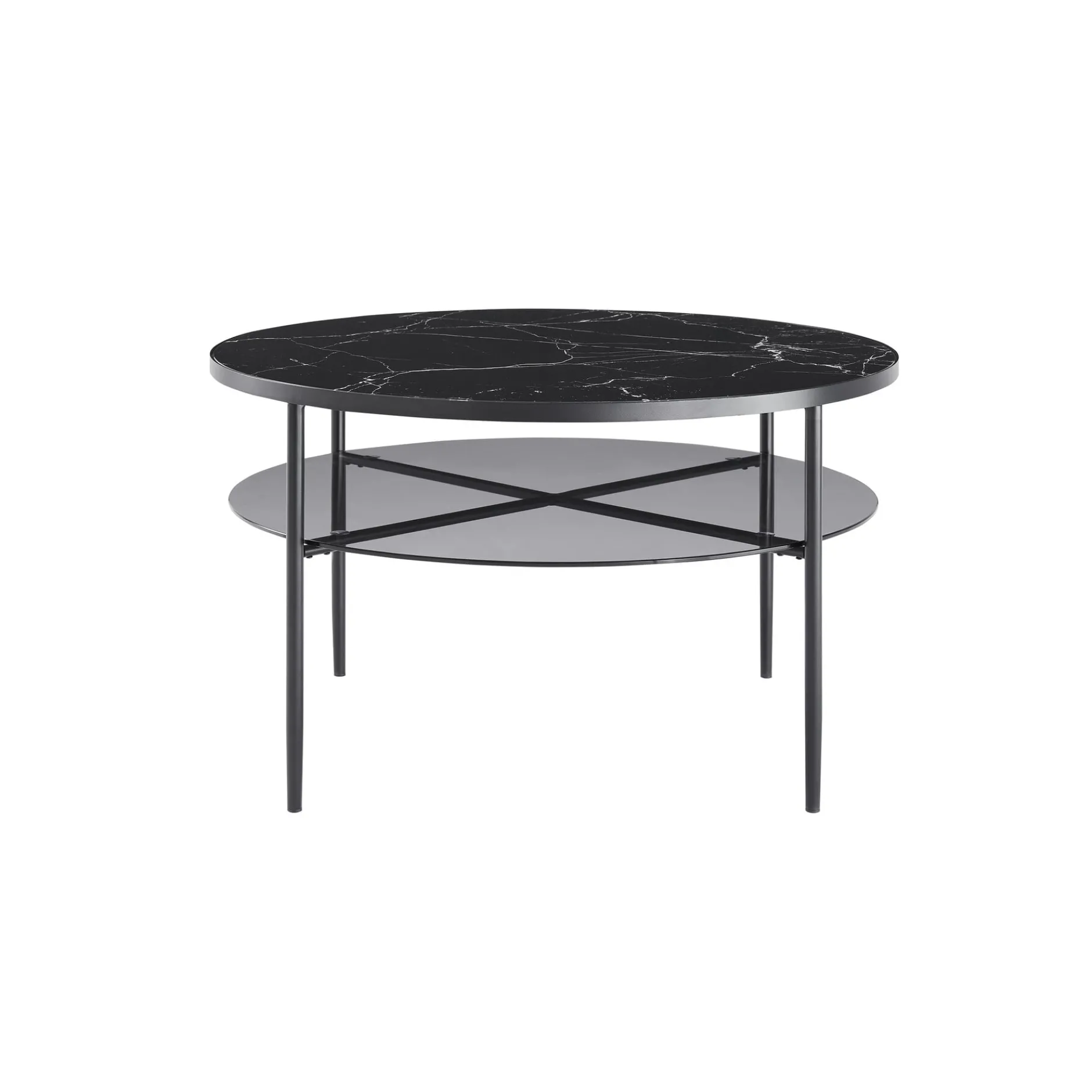 Een stijlvolle ronde salontafel met twee bladen voor extra functionaliteit. Het bovenblad heeft een luxe marmerprint, terwijl de onderste plank van getint glas een subtiele, moderne uitstraling geeft.