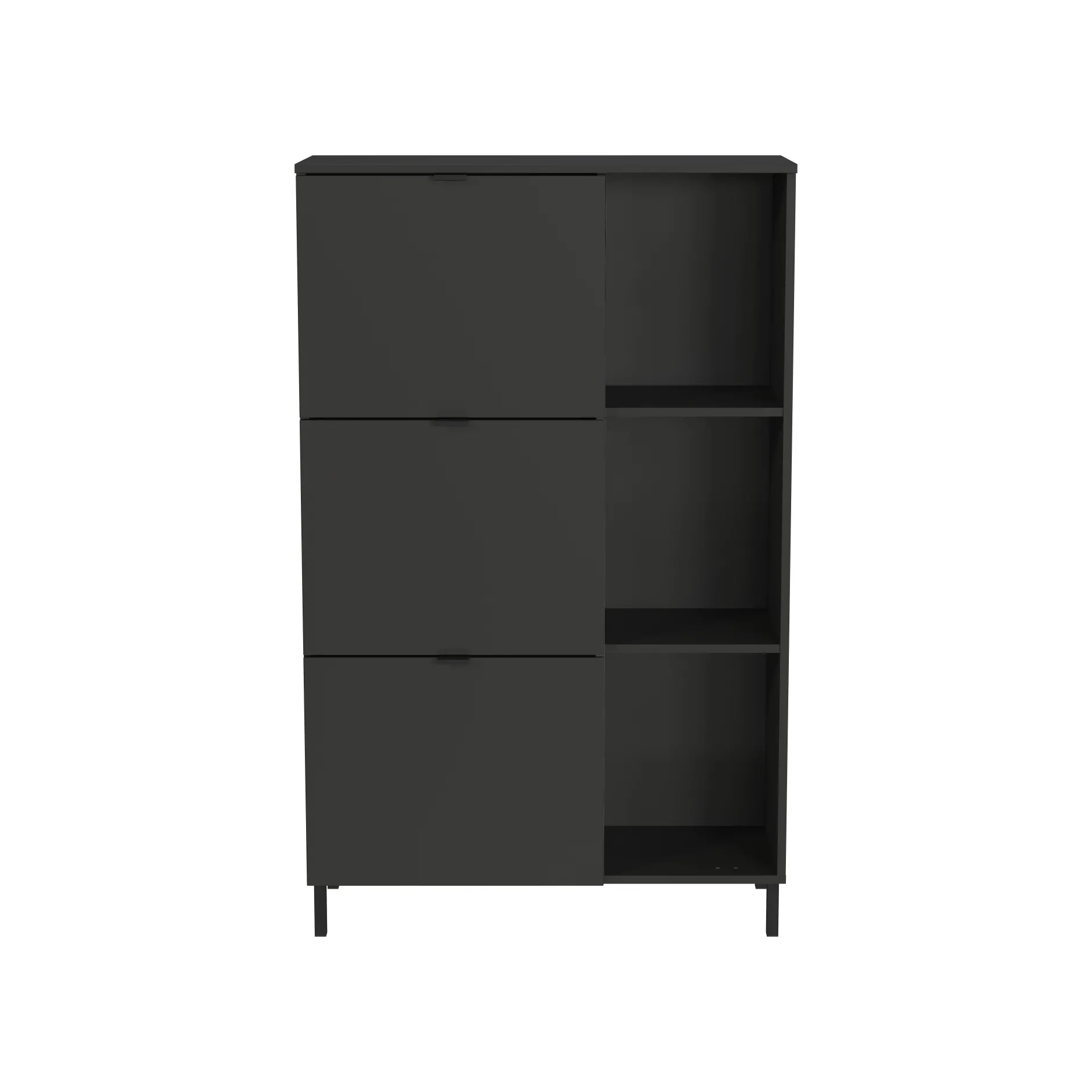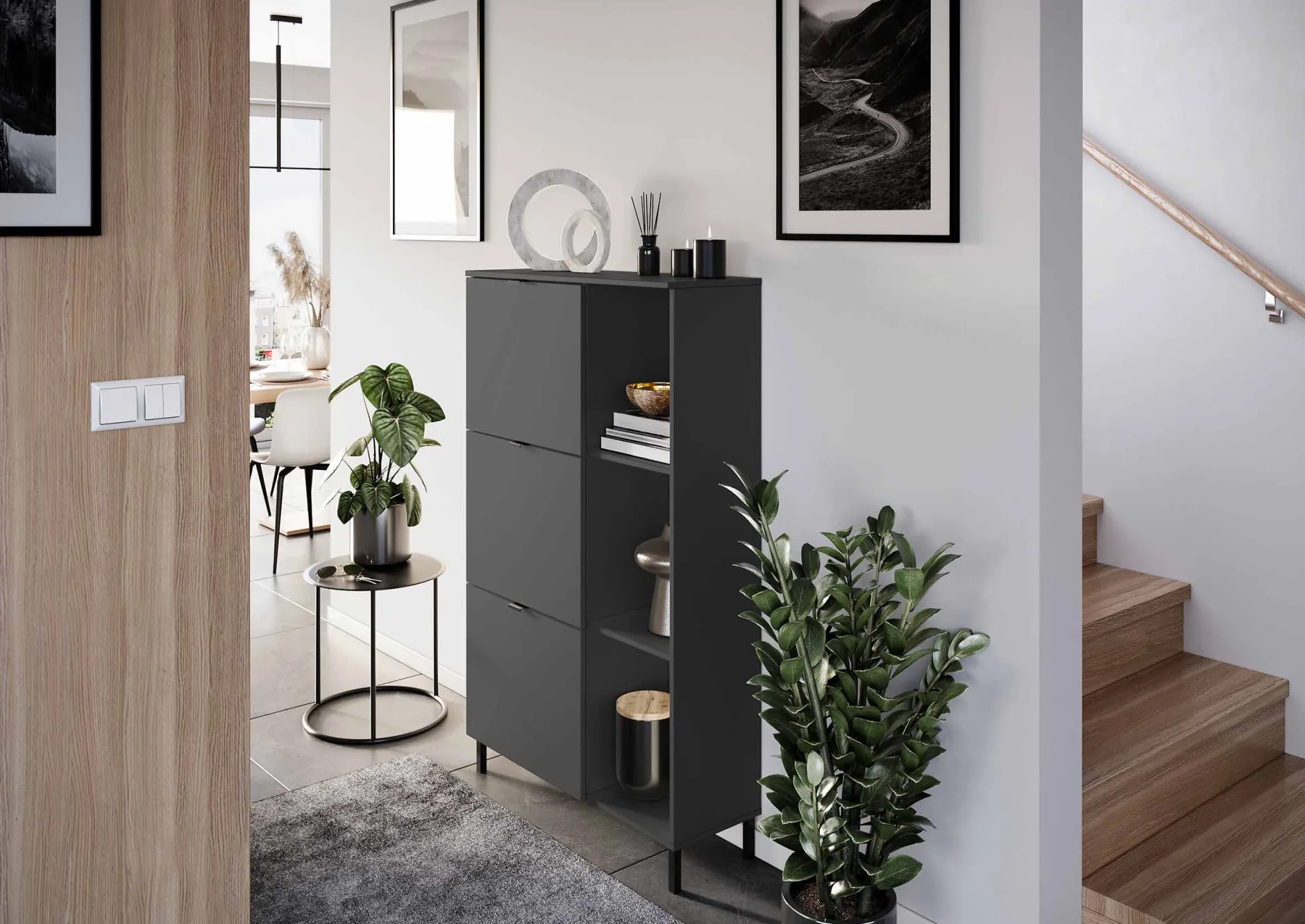 Deze schoenenkast met drie open compartimenten is een prachtige aanvulling op je interieur en biedt een georganiseerde oplossing voor het opbergen van je schoenen. Elk compartiment is belastbaar tot 10 kg en biedt ruimte voor in totaal 12 paar schoenen. Achter elk van de drie kleppen bevindt zich een metalen schoenenmand (elk belastbaar tot 8 kg), waardoor je schoenen netjes en opgeruimd blijven. De bovenste plank is belastbaar tot 5 kg en biedt extra opslagruimte. De kast is uitgevoerd in een eigentijdse grafietkleur en heeft drie stevige handgrepen en vier hoge poten, allemaal in zwart gepoedercoat, voor een moderne uitstraling. De schoenenkleppen sluiten langzaam, zacht en geruisloos dankzij de geïntegreerde demper, waardoor je je schoenen zonder enig geluid kunt opbergen. De metalen schoenenmanden zorgen voor een efficiënte en ruimtebesparende opslag. Bovendien kan deze kast in omgekeerde richting worden gemonteerd voor extra flexibiliteit. Deze schoenenkast is milieuvriendelijk en met trots gemaakt in Duitsland, wat staat voor kwaliteit en vakmanschap.