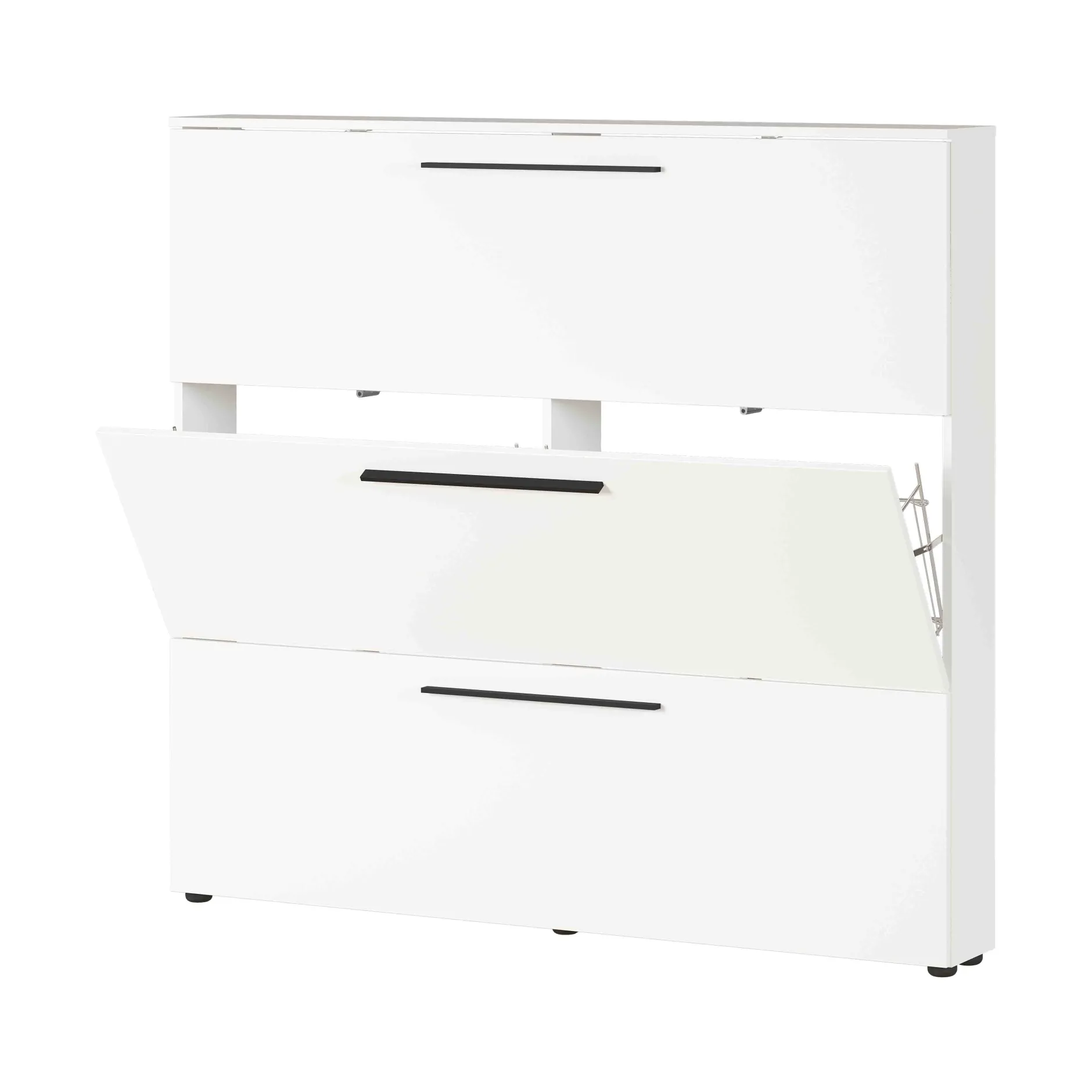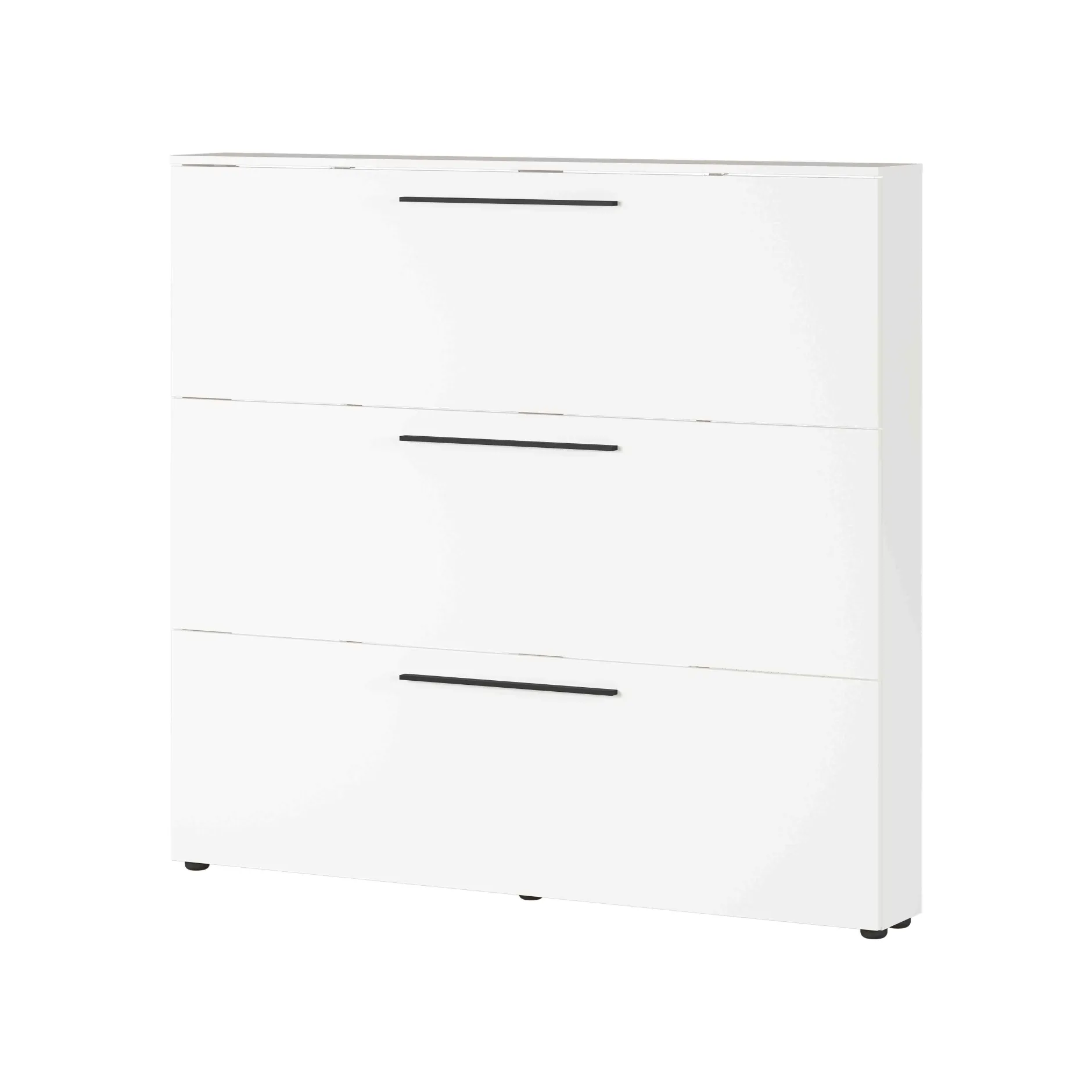 Met deze prachtige efficiënte schoenenkast is je hal snel opgeruimd! De schoenenkast heeft 3 vakken waarachter je ongeveer 18 paar schoenen kunt opbergen. De handvatten van gepoedercoat zwart metaal geven een mooi contrast aan het meubel. De meubelen uit deze prachtige serie geven elke hal een moderne stijlvolle look. De meubelen zijn gemaakt van hoogwaardige Duitse kwaliteit. Door een sterke melamine afwerking in combinatie met een ABS-kantafwerking ben je met deze meubels verzekerd van een lange levensduur. De meubels zijn eenvoudig te monteren met behulp van een duidelijke montagehandleiding. Leuk te combineren met de andere meubels uit deze serie!