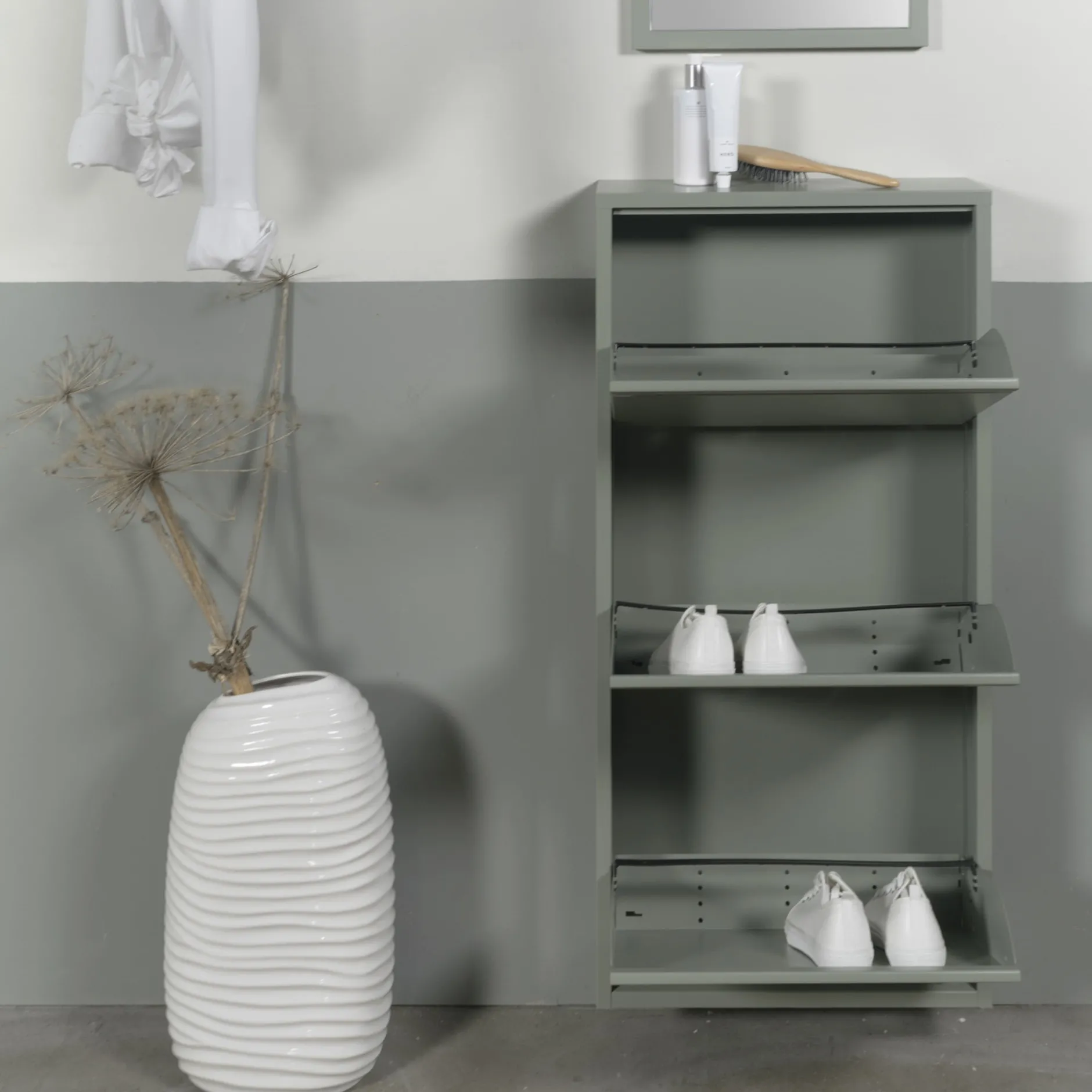Deze trendy schoenenkast uit de collectie Oscar is geproduceerd van hoogwaardigroestvrij staal en is afgewerkt met een mooie poedercoating. U kunt de kast door middel van kleppen netjes afsluiten. In de kast is plaats voor 9 paar schoenen. De schoenenkast is verkrijgbaar in de kleuren zwart, wit en groen.