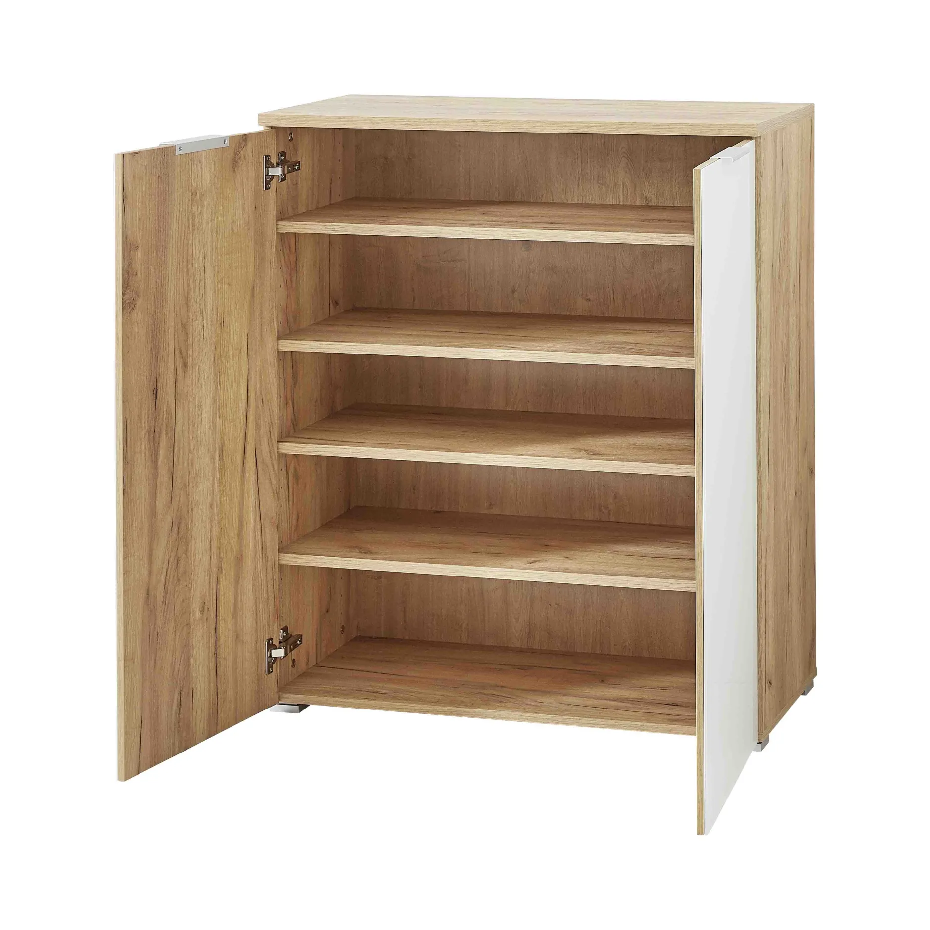 Klassieke schoenenkast met voldoende ruimte voor ongeveer 20 paar schoenen. De deuren zijn voorzien soft-close voor een geruisloze sluiting. De meubelen zijn gemaakt van hoogwaardige Duitse kwaliteit. Door een sterke melamine afwerking in combinatie met een ABS-kantafwerking ben je met deze meubels verzekerd van een lange levensduur. De meubels zijn eenvoudig te monteren met behulp van een duidelijke montagehandleiding.