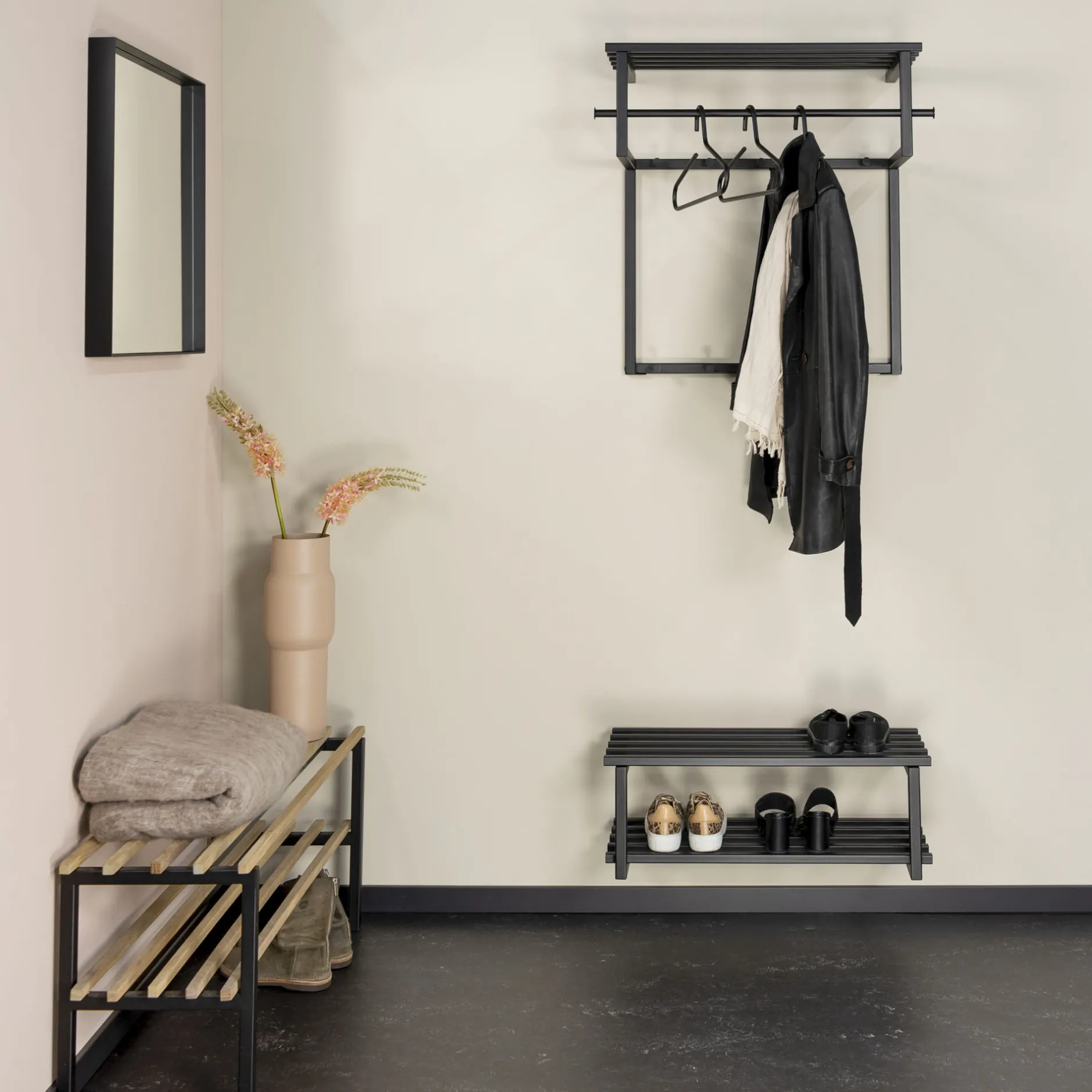 Met dit degelijke schoenenrek ben je verzekerd van een opgeruimde hal. Het schoenenrek is vervaardigd van een stevig staal en afgewerkt met een sterke poeder coating. Je bergt gemakkelijk 6 paar schoenen op in dit rek en het is leuk te combineren met de andere elementen uit deze collectie!