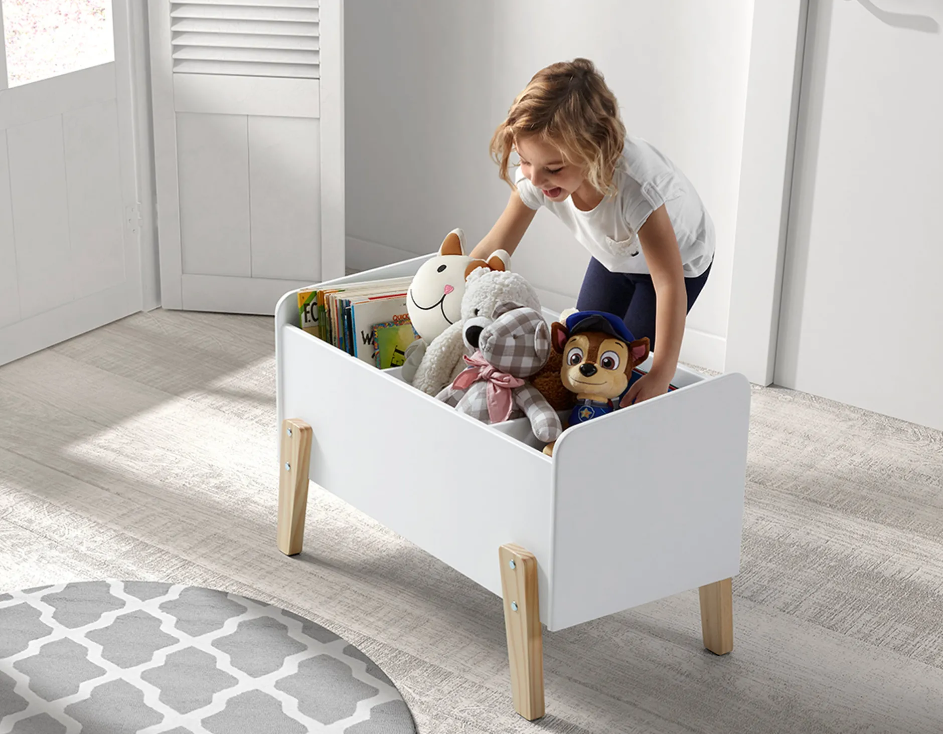 Deze speelgoedkoffer zorgt ervoor, dat de kamer steeds opgeruimd zal zijn. Speelgoed, boeken en andere leuke dingetjes zullen er ordelijk in worden opgeborgen. De koffer is vervaardigd uit hoogwaardig wit gelakt MDF met massief grenen, schuin ingezette poten.
