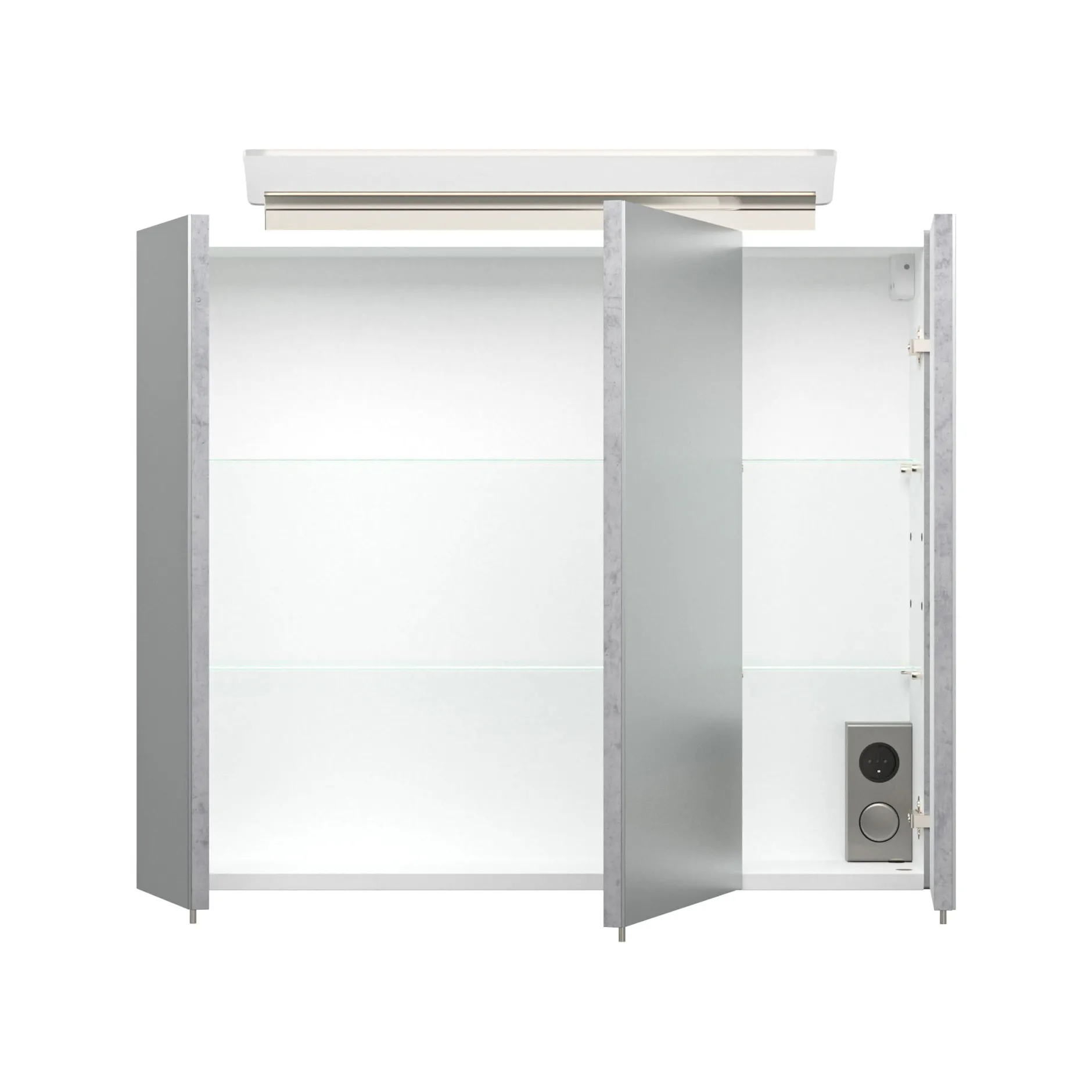 Deze spiegelkast kan door zijn strakke design een plaatsje vinden in elke badkamer. Door zijn 10 watt neutraal witte lamp ben je verzekerd van goed licht! (4000 Kelvin). Achter de deuren, voorzien van soft-close, bevinden zich 4 glazen planken om al je spullen op te bergen, ook bevindt zich hier de aan/uit knop in combinatie met een stopcontact. Deze kast is afgewerkt met een beton melamine en is 75cm breed, 62cm hoog en 17cm diep.