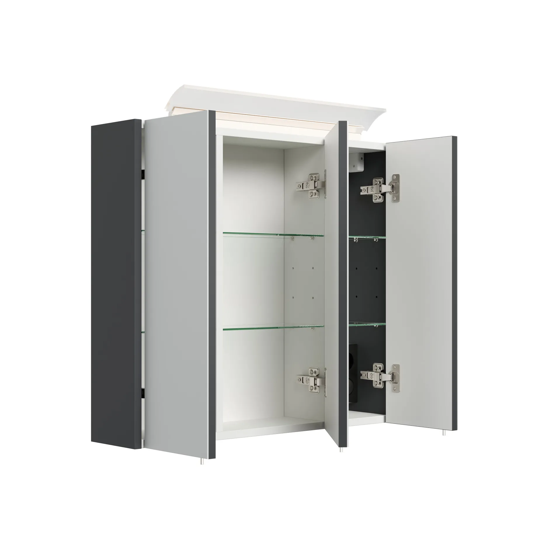 De Spiegelkast Calais Grafiet 70 cm biedt een strakke en moderne badkameroplossing, ontworpen in Duitsland. Dit meubel, vervaardigd uit een degelijke spaanplaat en afgewerkt met een matte grafiet Softtouch-coating, zorgt voor een onderhoudsvriendelijke en eigentijdse look. Met 2 spiegeldeuren en 6 flexibel inzetbare glazen planken is er volop ruimte voor al je badkameraccessoires, terwijl de soft-close mechanismen zorgen voor een stille werking. De afmetingen zijn 70 x 62 x 17 cm.