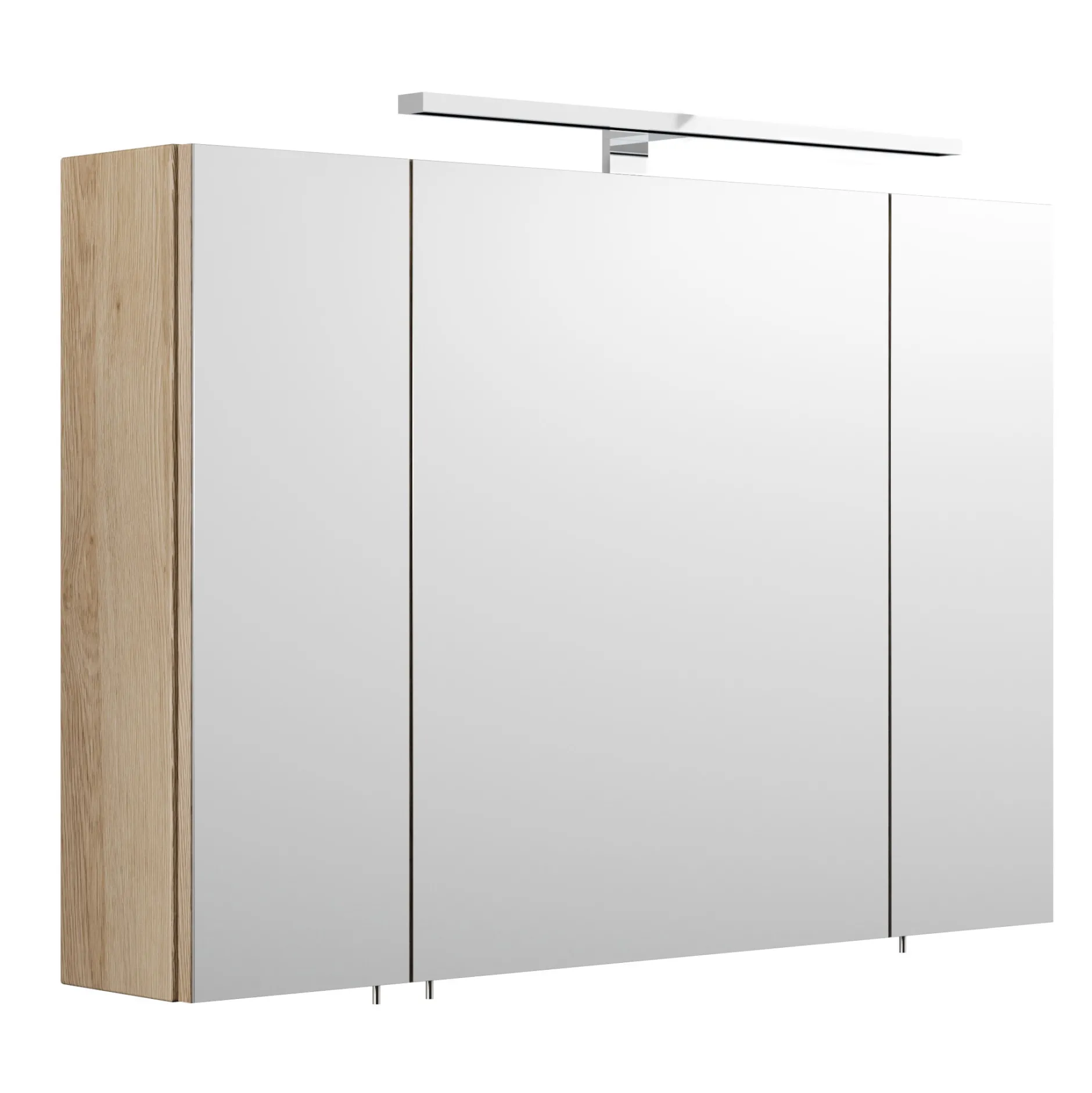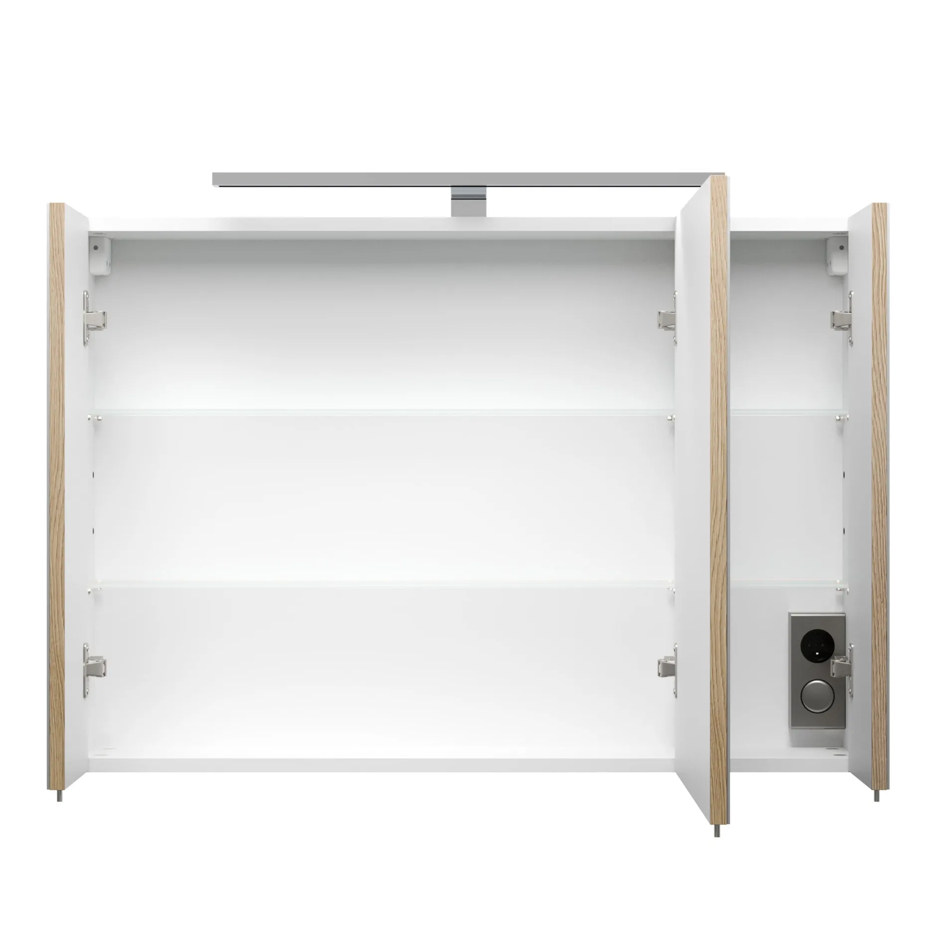 Deze spiegelkast heeft een klassieke uitstraling en is toepasbaar in veel omstandigheden. De spiegelkast is voorzien van een 8 watt chroomkleurige ledlamp welke in elke omstandigheid goed neutraal wit licht geeft. Achter de 3 deuren, voorzien van soft-close, bevinden zich 2 glazen planken om al je spullen op te bergen, ook bevindt zich hier de aan/uit knop in combinatie met een stopcontact. Deze kast is afgewerkt met een melamine waardoor deze goed schoon te maken is. De kast is 90cm breed, 62cm hoog en 17cm diep en is te verkrijgen in het wit, eiken, walnoot en antraciet.