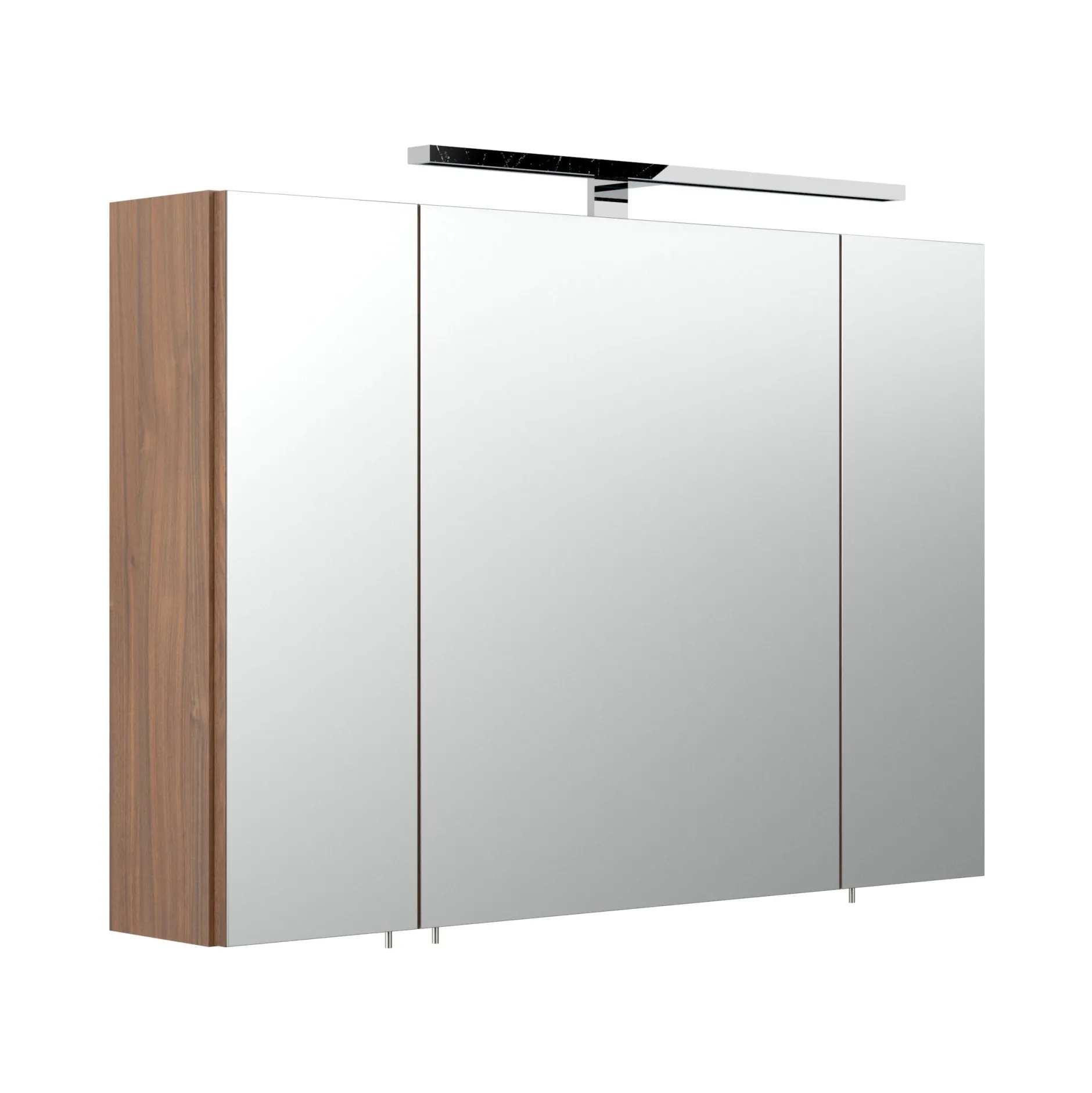 Deze spiegelkast heeft een klassieke uitstraling en is toepasbaar in veel omstandigheden. De spiegelkast is voorzien van een 8 watt chroomkleurige ledlamp welke in elke omstandigheid goed neutraal wit licht geeft. Achter de 3 deuren, voorzien van soft-close, bevinden zich 2 glazen planken om al je spullen op te bergen, ook bevindt zich hier de aan/uit knop in combinatie met een stopcontact. Deze kast is afgewerkt met een melamine waardoor deze goed schoon te maken is. De kast is 90cm breed, 62cm hoog en 17cm diep en is te verkrijgen in het wit, eiken, walnoot en antraciet.