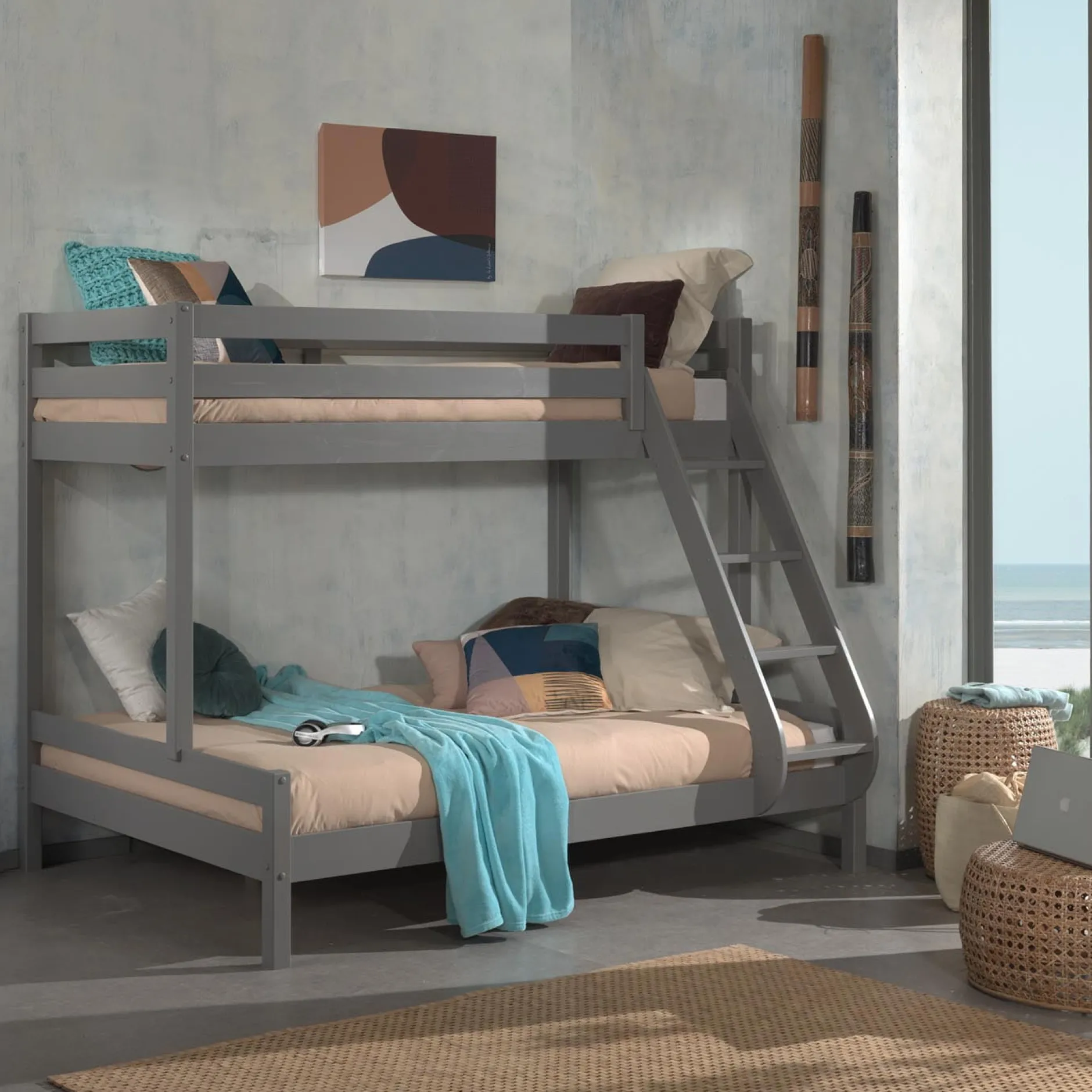Met dit robuuste familiebed heb je altijd voldoende slaapplaatsen. Door de ronding in de trap kun je op het onderste bed vrijuit bewegen. Het bed is gemaakt van Scandinavisch grenen en afgewerkt met een sterke lak. De lattenbodems zijn inclusief. In het bovenste bed kan een matras van 90×200 cm en in het onderste bed een matras van 140×200 cm.