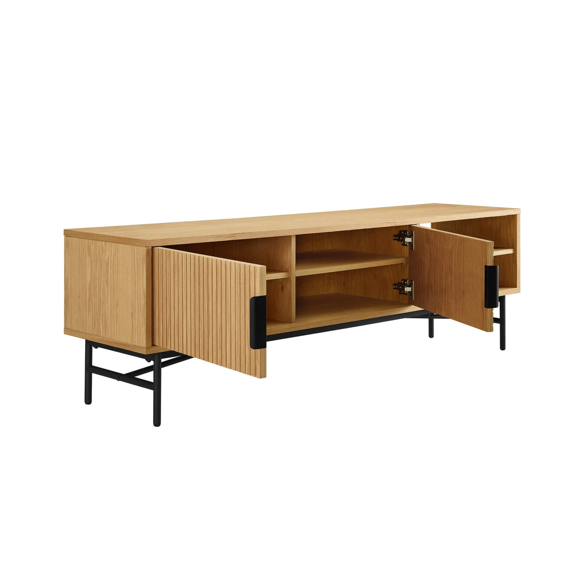 De deuren van dit degelijke tv-meubel zijn voorzien van soft-close waardoor deze geruisloos sluiten. Achter elke deur bevindt zich 1 verstelbare legplank. Dit meubel is vervaardigd uit een combinatie van gefineerd eiken MDF en melamine. Het zwarte gepoedercoate metalen frame maakt dat dit meubel stevig staat. Gemakkelijk te monteren door middel van bijgeleverde montagehandleiding. Leuk te combineren met de andere artikelen uit deze serie!