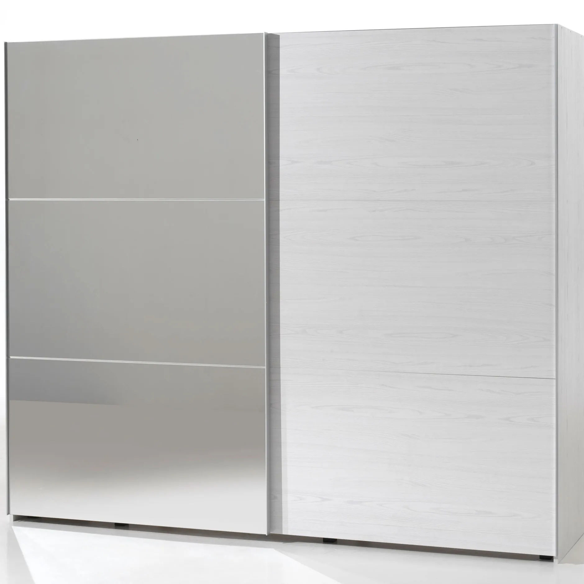 Deze riante tweedeursschuifdeurkast heeft bovenin achter de deuren een legplank en daaronder hangt een kledingroede. Achter de linkerdeur zijn links nog 4 kleine legplanken en links onderin 1 legplank. Achter de rechter deur zijn bovenin een legplank met daaronder een roede. Onderin is nog een brede legplnak. Zie ook de teking van de kast met indeling bij de foto’s.. Op de deuren is een decoratieve maar ook praktische spiegel. Totale breedte 250 cm.