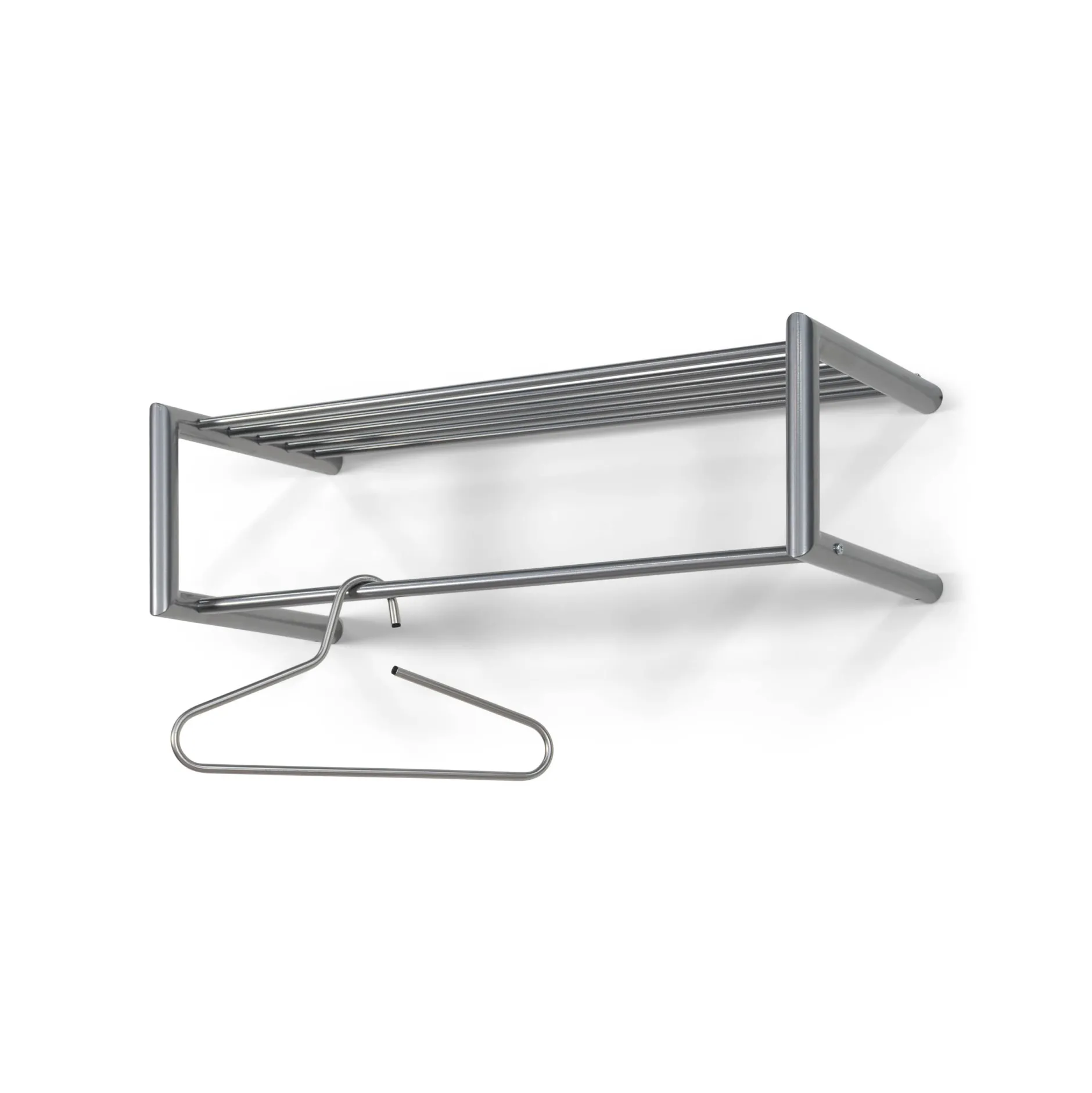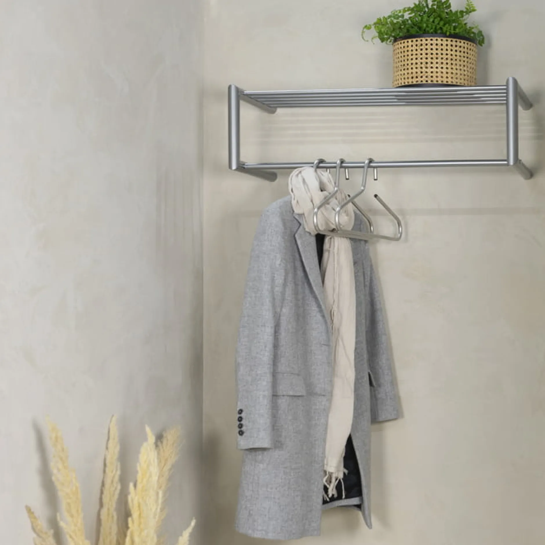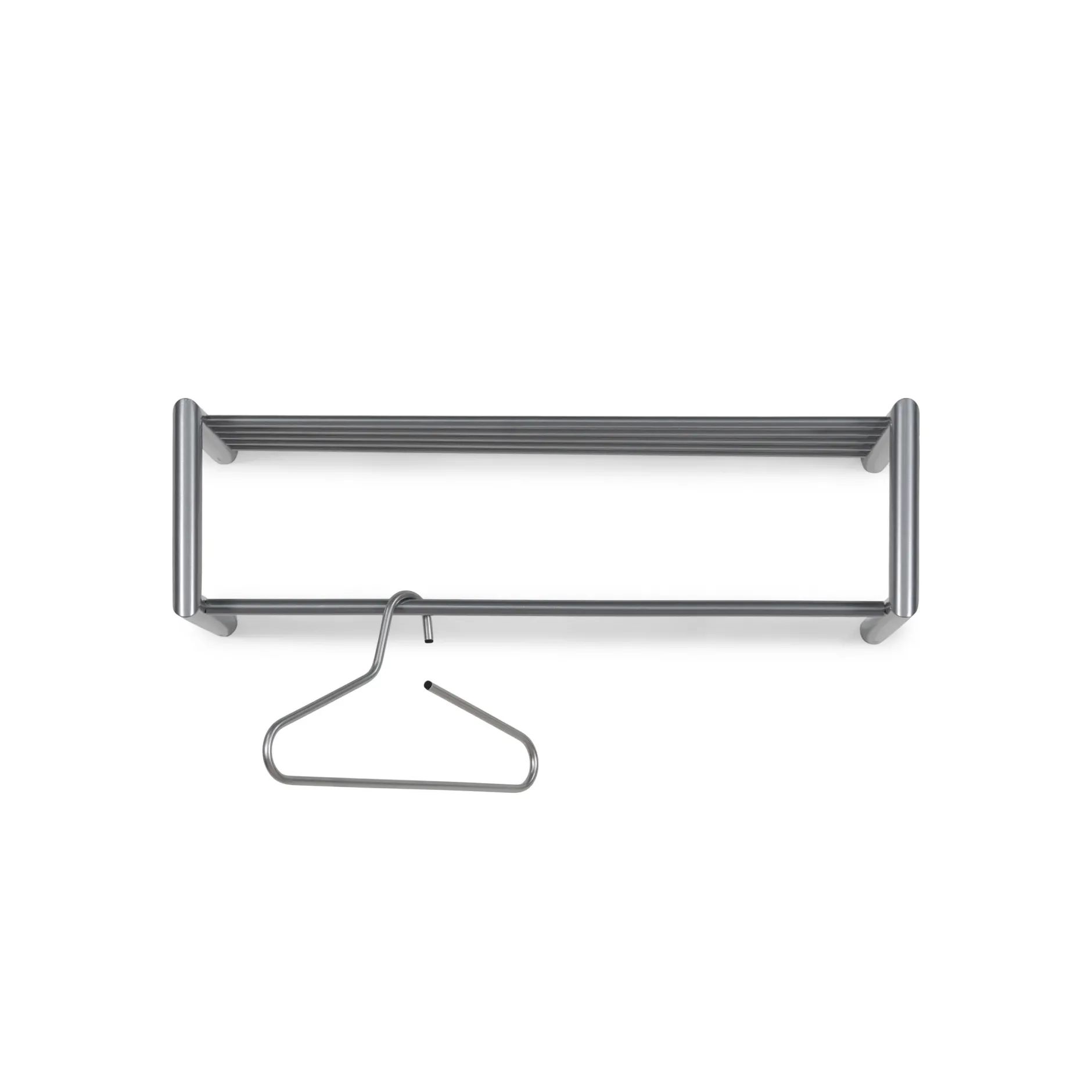 Moderne handige kapstok met voldoende ruimte voor kledinghangers. Bovenop ruimte voor diverse overige kledingstukken. Afgewerkt in een degelijke zwarte epoxy-lak.