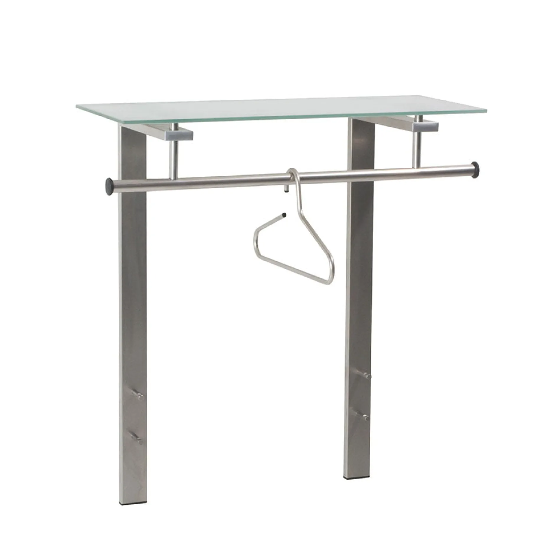 Moderne handige kapstok met bovenaan ruimte voor de kledinghaken. Bovenop een melkglazen blad met ruimte voor diverse kledingstukken. Afgewerkt in nikkelkleur. Exclusief de afgebeelde kledinghanger.