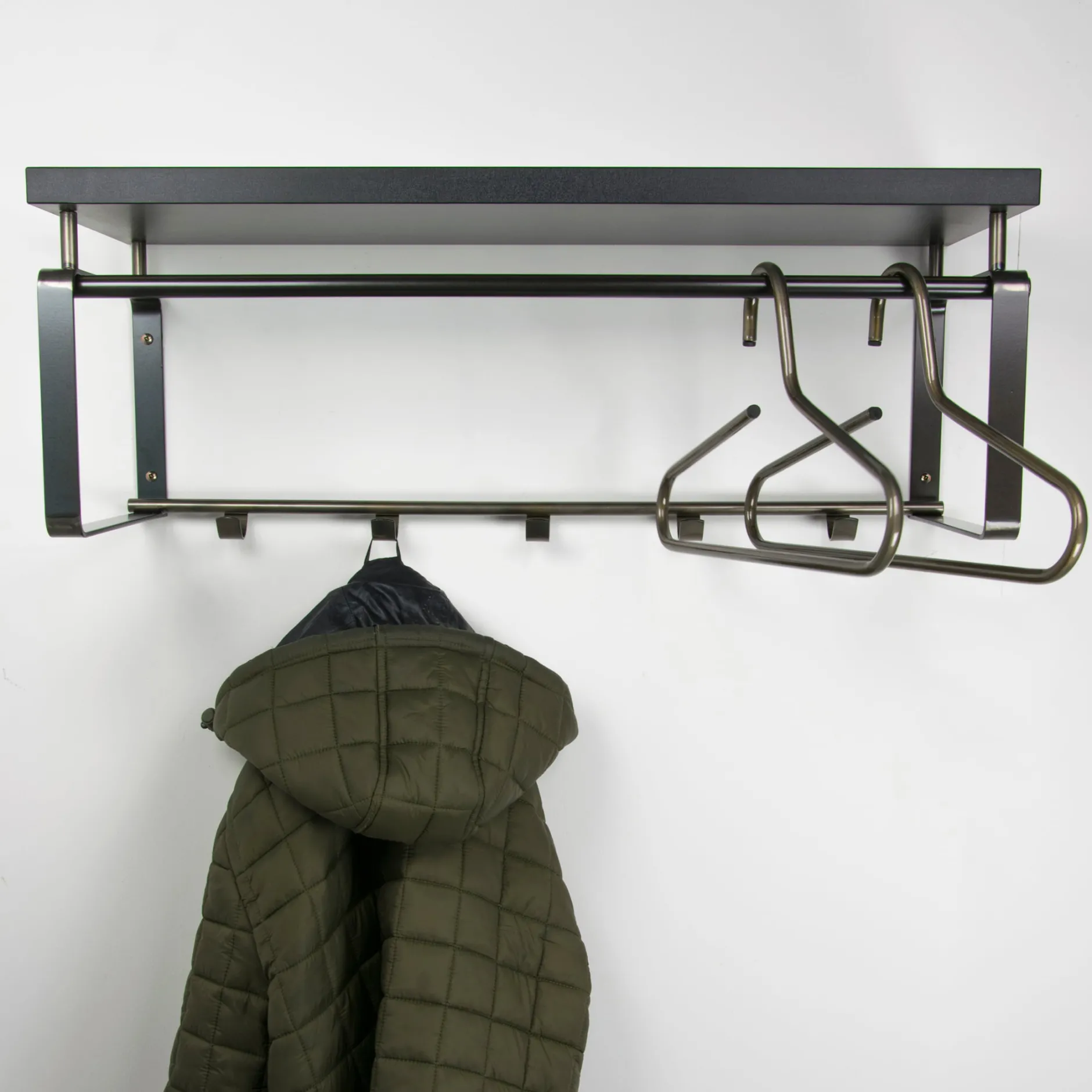 De kapstok is volledig gemaakt van hoogwaardig metaal en afgewerkt in een sterke witte fijnstructuur epoxy poedercoat. Exclusief de afgebeelde kledinghanger. Aan de onderste stang zitten 5 haken voor het ophangen van jassen en bovenop is een wit geverfde houten plank.