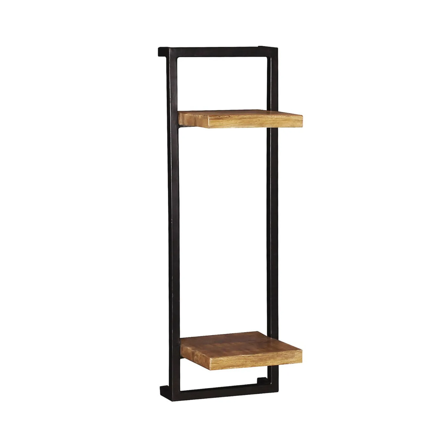 Dit wandrek van massief mango hout met een zwart metalen frame biedt twee ruime planken. Het industriële ontwerp zorgt voor een stoere uitstraling en maakt het rek geschikt voor diverse ruimtes.