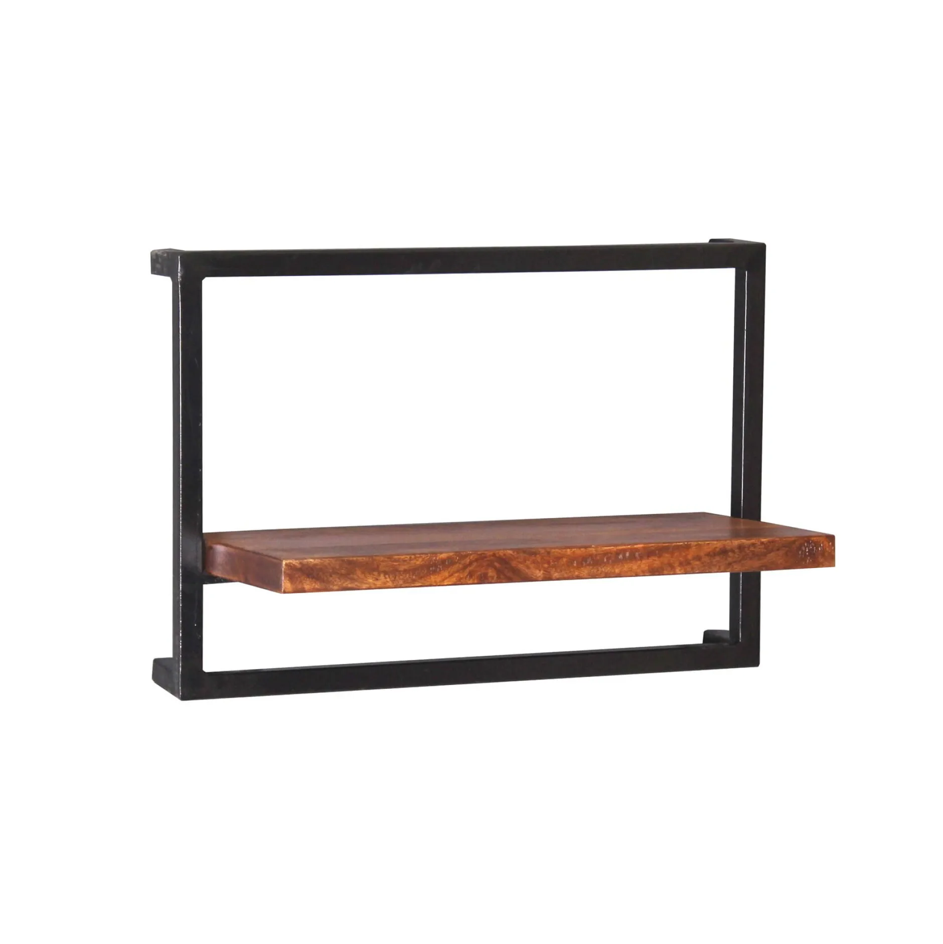 Een stevig wandrek met één brede plank van mango hout en een metalen frame. Perfect voor boeken, decoratie of servies. De combinatie van hout en metaal zorgt voor een stoere uitstraling.