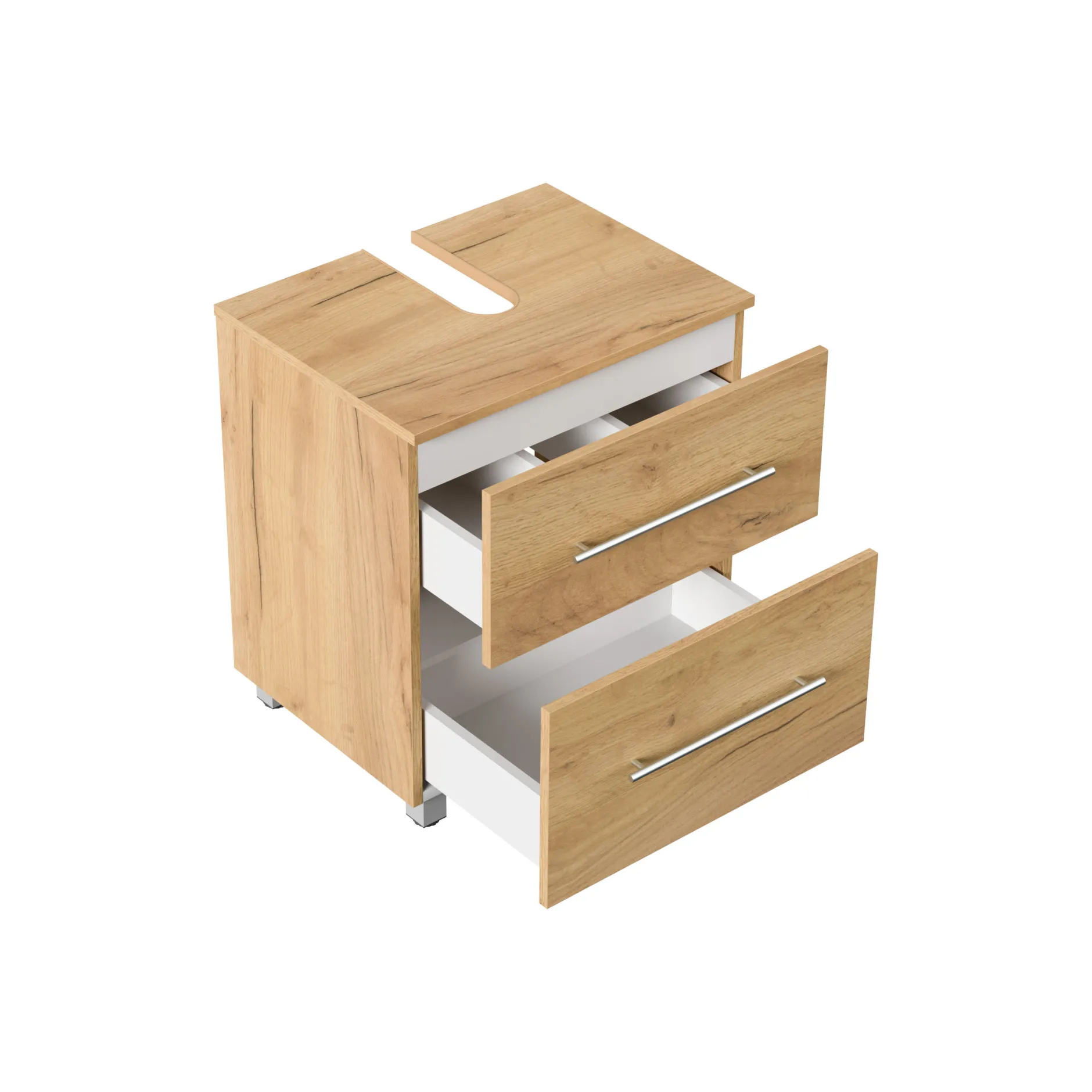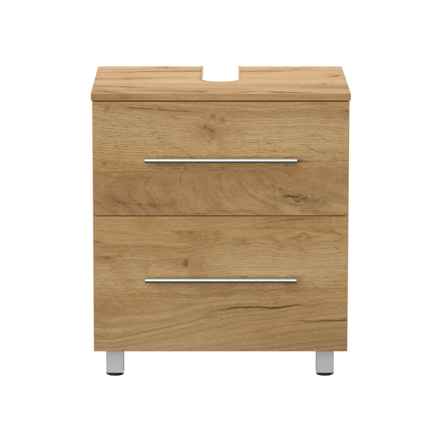 De Wastafelkast Glasgow Eiken 55 cm brengt een warme, natuurlijke sfeer in je badkamer. Ontworpen in Duitsland en vervaardigd uit hoogwaardig spaanplaat, is dit meubel afgewerkt in een realistische eiken Gold-look, wat zorgt voor een authentieke houtuitstraling. Met soft-close deuren en laden biedt deze kast ruime opbergruimte. De afmetingen zijn 55 cm breed, 63 cm hoog en 41,6 cm diep.