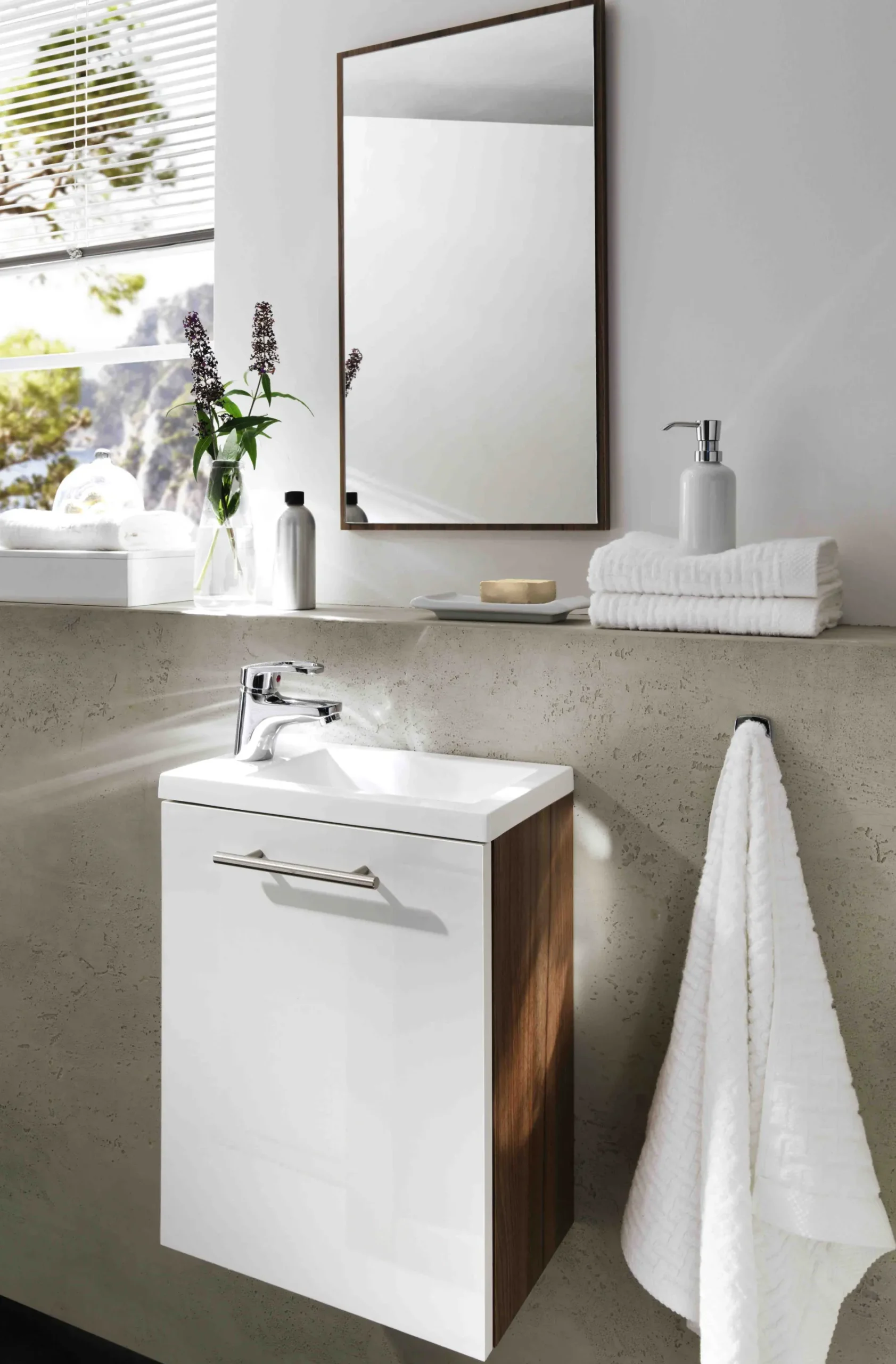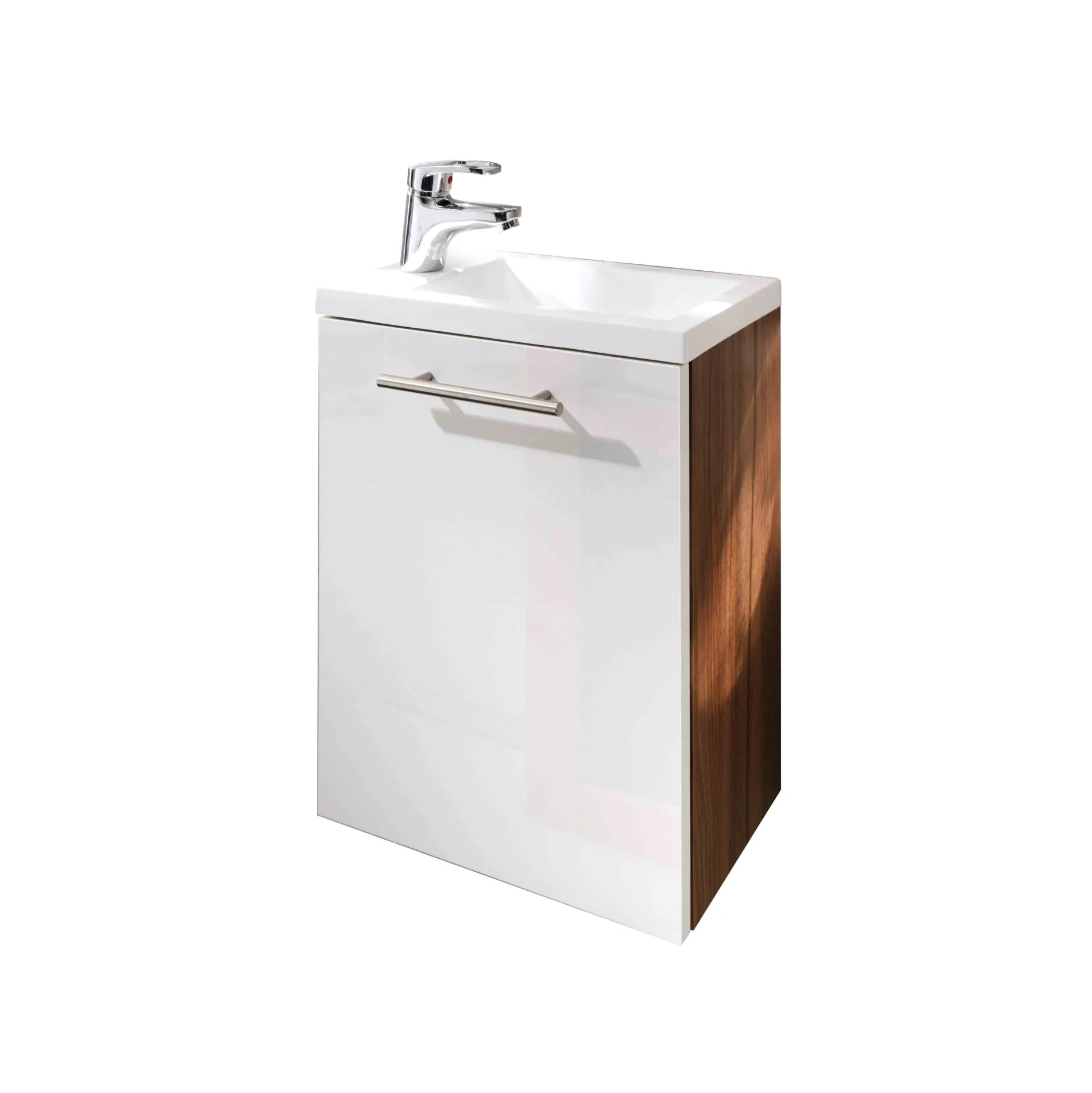 Deze praktische wastafel kun je gemakkelijk in de kleinere ruimte kwijt. Met zijn afmetingen van 40 cm breed, 50,5 cm hoog en 22 cm diep ook goed te plaatsen in een toilet. Het deurtje kan zowel linksom- als rechtsom gemonteerd worden. Het meubel is afgewerkt met hoogglans spaanplaat-fronten en door zijn melamine afwerking is deze kast gemakkelijk schoon te houden en langer beschermd tegen stof, vuil en krassen. De wastafelkast wordt geleverd exclusief kraan, toevoerleidingen naar de kraan, afvoerplug en zwanenhals.