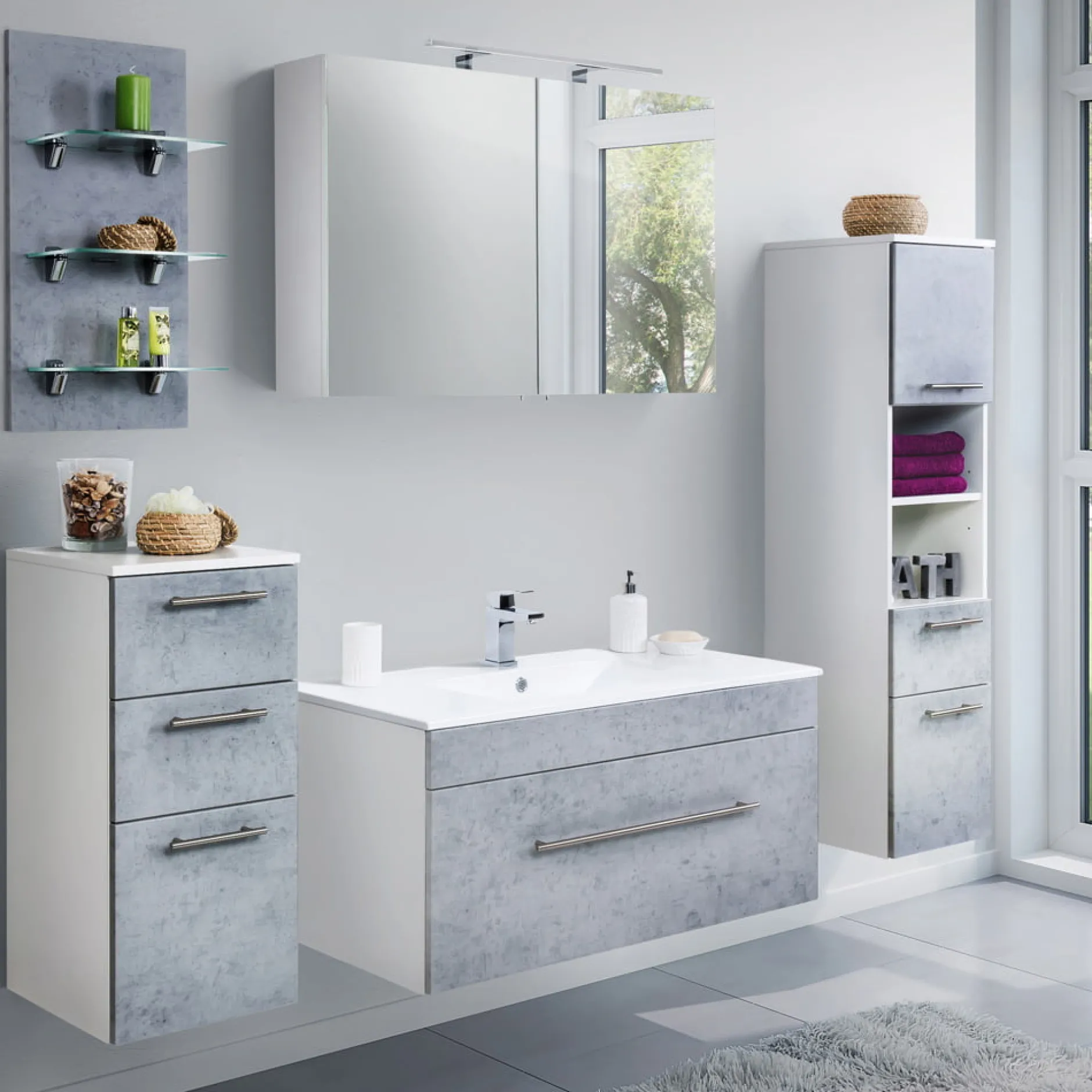De wastafelkast wordt geleverd exclusief kraan, toevoerleidingen naar de kraan, afvoerplug en zwanenhals. De wastafelkast is verkrijgbaar in 3 afmetingen Small, Medium en Large en kan worden uitgevoerd in hoogglans wit, zwart, antraciet, beton-look en eiken.