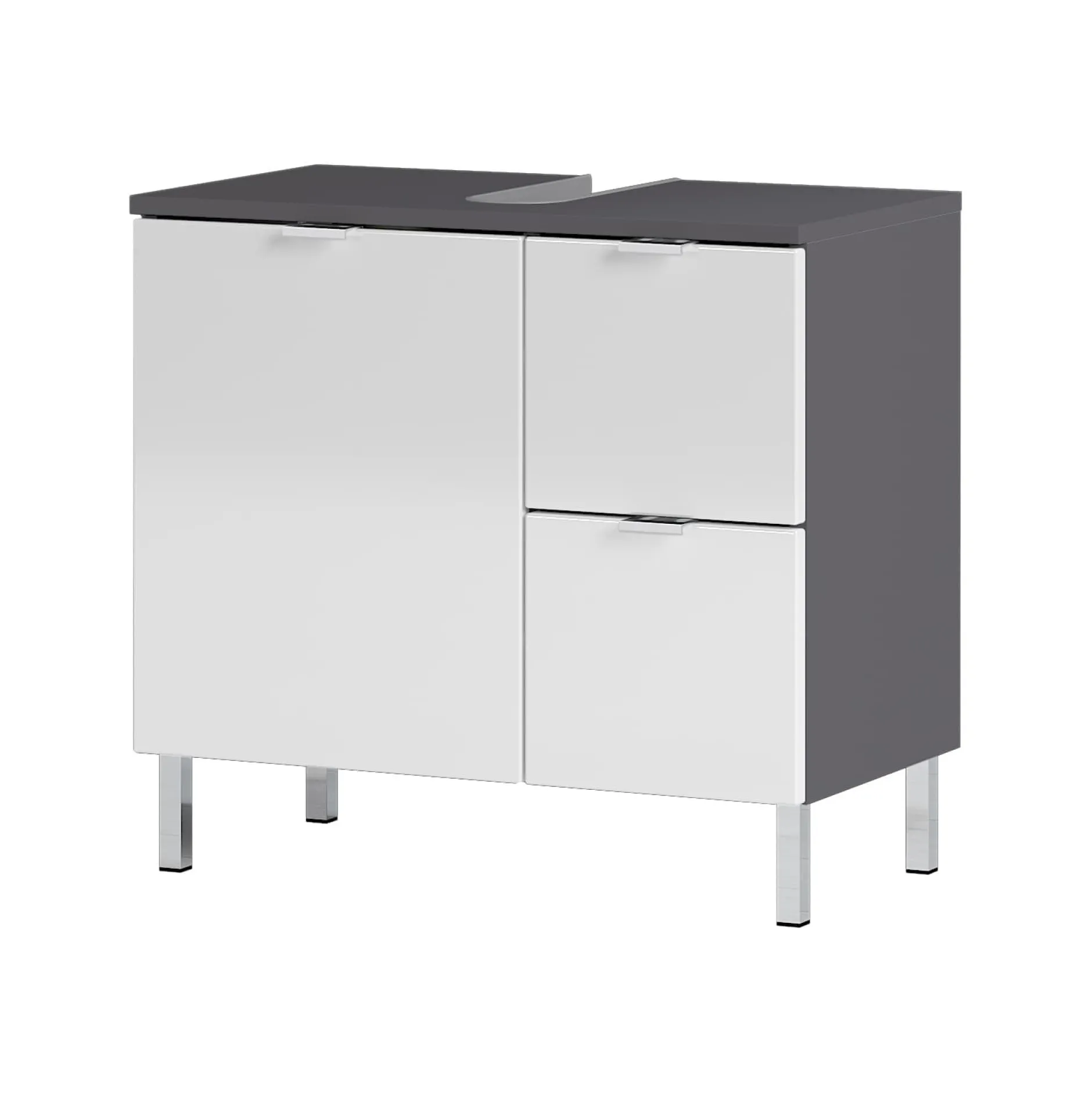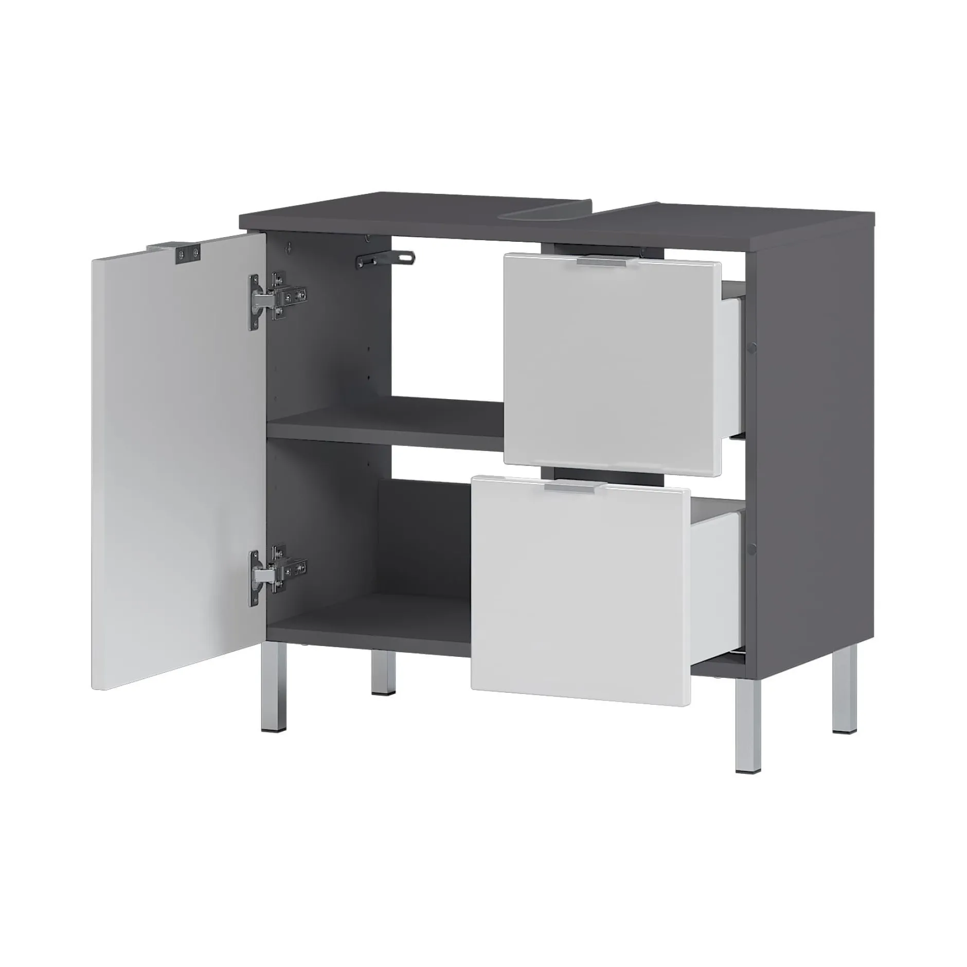 Met deze stijlvolle wastafelkast geef je je badkamer snel een luxe uitstraling. De badkamerkast heeft twee laden en een deur met daarachter een verstelbare legplank waardoor er voldoende ruimte is om al je spullen op te bergen. De deuren en lades zijn voorzien van soft-close waardoor ze geruisloos sluiten. Het meubel is afgewerkt met een degelijke melamine waardoor deze goed schoon te maken is. Maak je badkamer compleet met de andere meubelen uit deze serie.