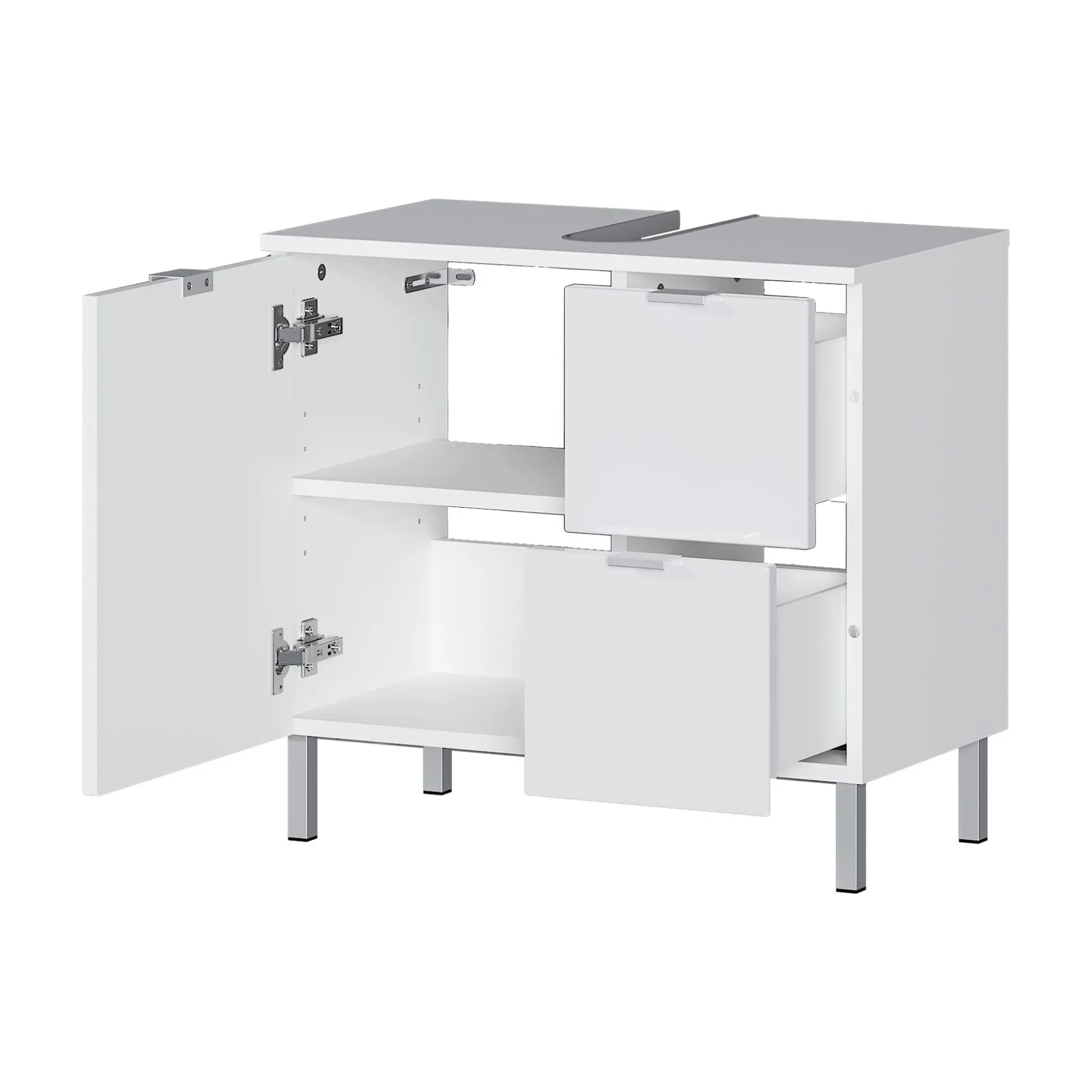 Met deze stijlvolle wastafelkast geef je je badkamer snel een luxe uitstraling. De badkamerkast heeft twee laden en een deur met daarachter een verstelbare legplank waardoor er voldoende ruimte is om al je spullen op te bergen. De deuren en lades zijn voorzien van soft-close waardoor ze geruisloos sluiten. Het meubel is afgewerkt met een degelijke melamine waardoor deze goed schoon te maken is. Maak je badkamer compleet met de andere meubelen uit deze serie.