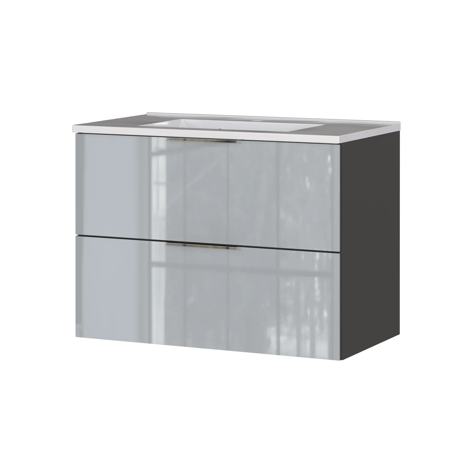 Deze wastafelkast brengt stijl en functionaliteit naar je badkamer. Met twee royale laden (elk belastbaar tot 10 kg) en een moderne uitstraling, combineert dit meubel vorm en functie op perfecte wijze. De glazen fronten in zilvergrijs, samen met het grafietkleurige lichaam, creëren een eigentijdse uitstraling.