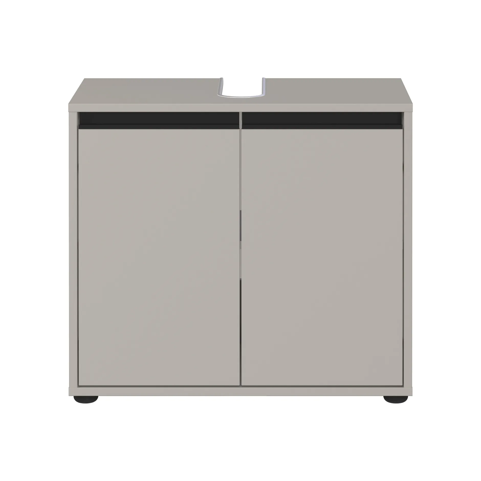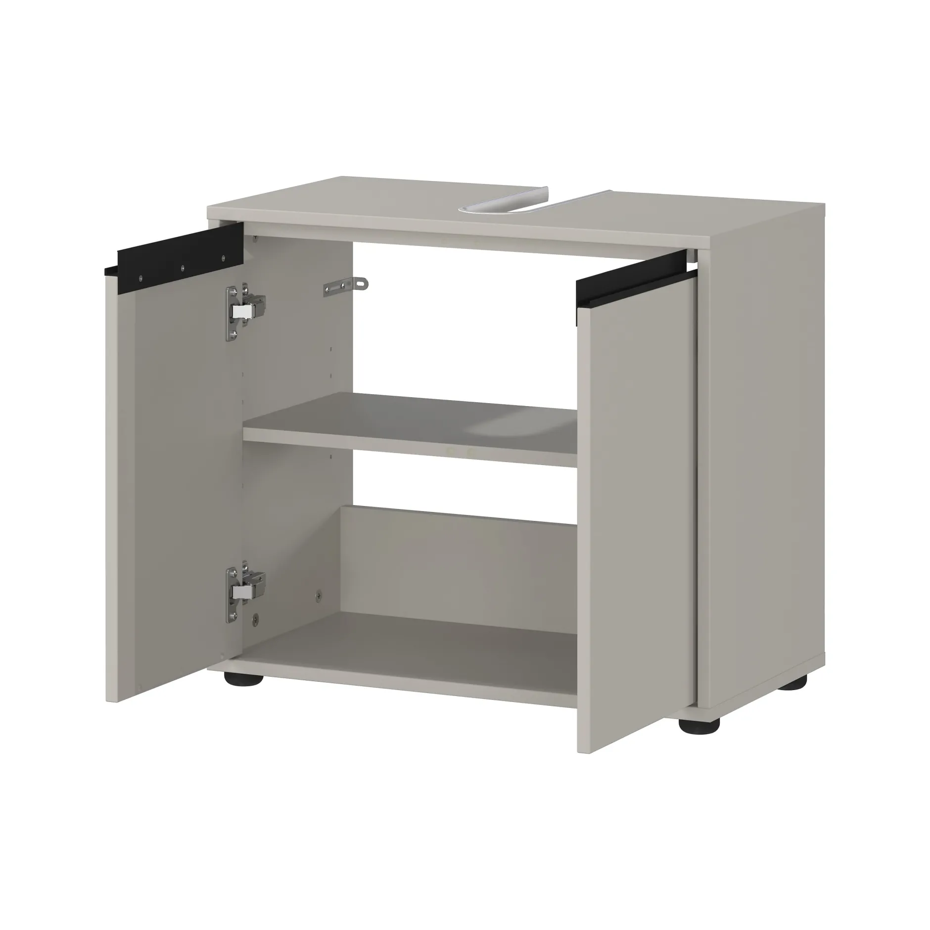 De wastafelkast Pula Lichtgrijs 63 cm is een praktische en stijlvolle oplossing voor extra opbergruimte in de badkamer. Dit meubel heeft twee deuren met daarachter een verstelbare plank, die belastbaar is tot 10 kg. Het bovenpaneel bevat een uitsparing voor de sifon en kan tot 3 kg dragen, terwijl de onderste plank tot 10 kg belastbaar is. De kast is voorzien van twee zwarte metalen handgrepen en staat op vier stevige kunststof meubelglijders. De krasbestendige melamine coating en stootvaste ABS-randen zorgen voor een lange levensduur, terwijl de geïntegreerde demping een geruisloos sluitmechanisme garandeert.