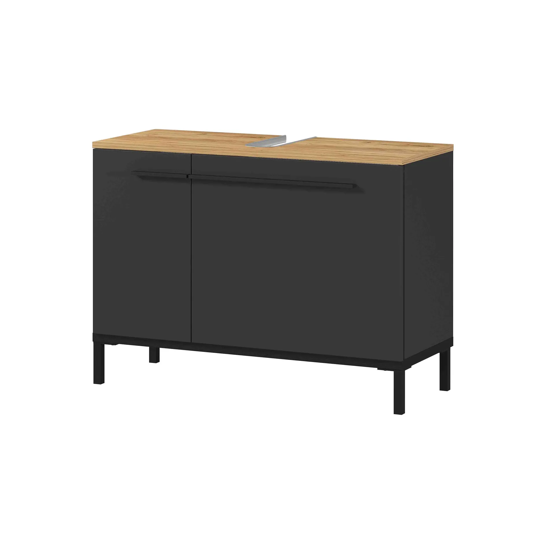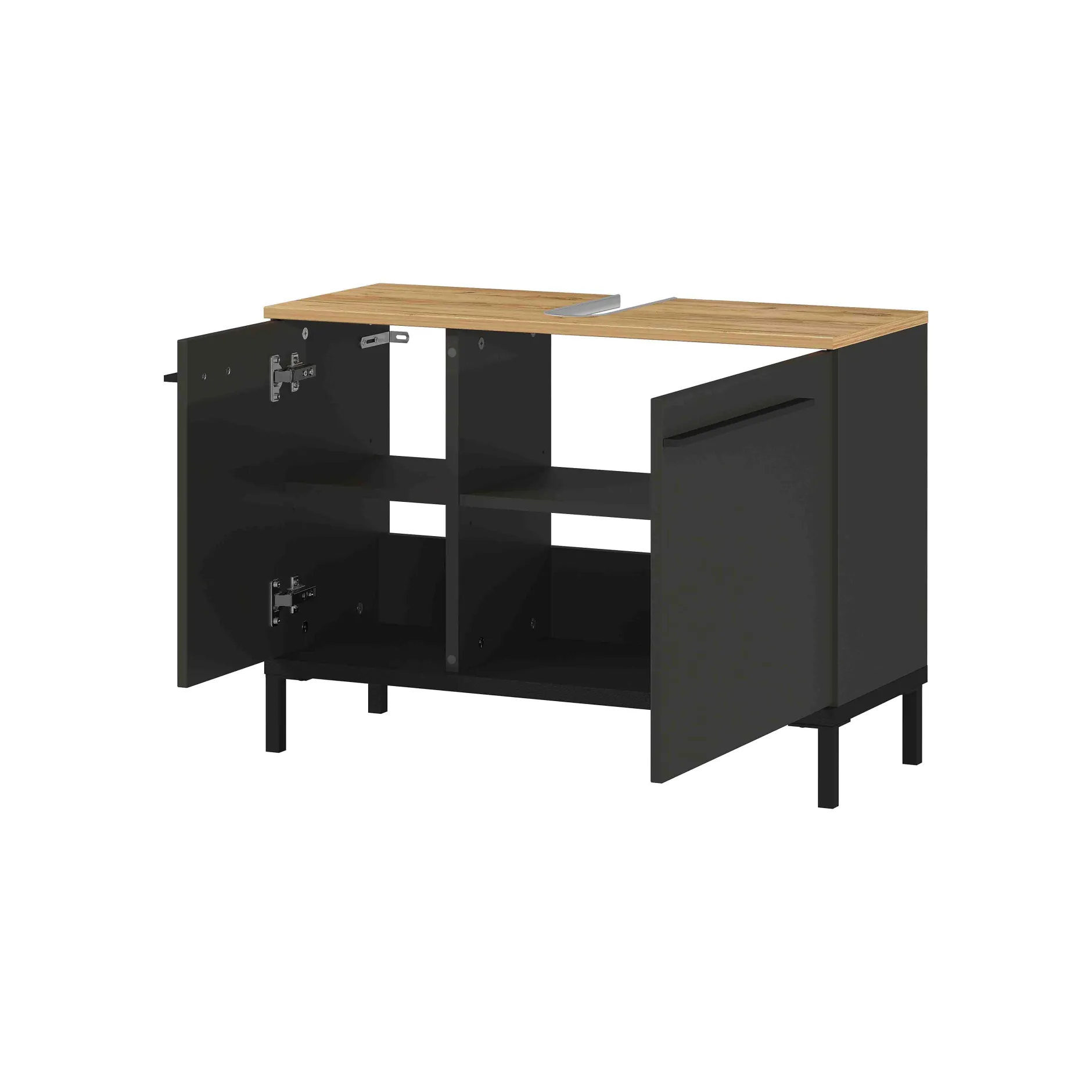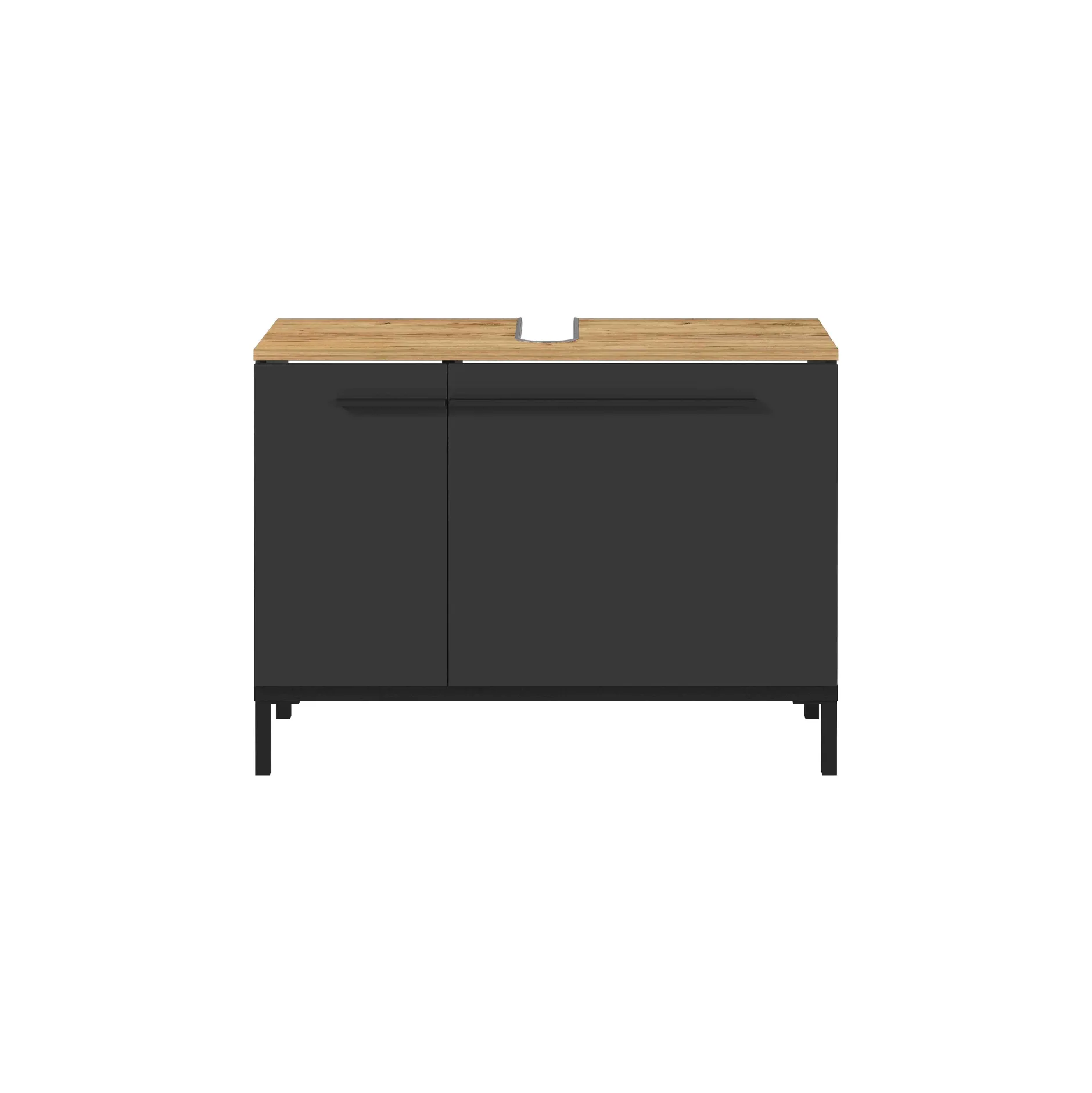 Deze stijlvolle badkamerkast vindt gemakkelijk zijn plaats. Voldoende opbergruimte achter de deuren op de 2 verstelbare legplanken. Zwart metalen handvatten en pootjes in combinatie met geruisloos sluitende deuren maken dit meubelstuk helemaal af. Geproduceerd in Duitsland, dit staat voor degelijke kwaliteit en een lange levensduur. Gemakkelijk te monteren doormiddel van de meegeleverde montagehandleiding. Bekijk ook de andere elementen uit deze badkamerserie!