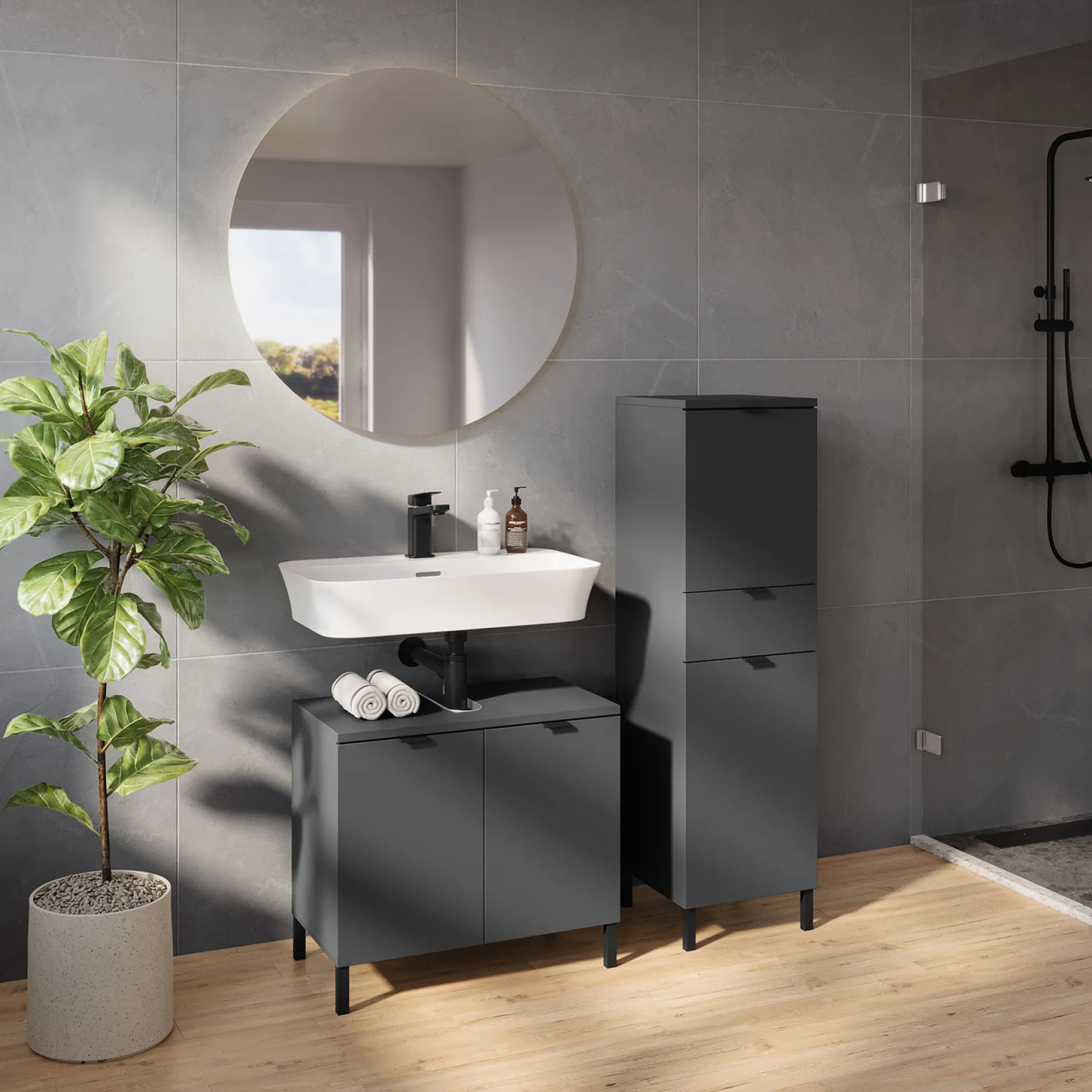 De wastafelkast Zadar Grafiet 60 cm is een stijlvolle en functionele toevoeging aan elke badkamer. Dit meubel is voorzien van twee deuren met een verstelbare plank erachter, belastbaar tot 10 kg. De bovenste plank heeft een uitsparing voor de sifon en kan tot 3 kg dragen, terwijl de onderste plank tot 10 kg belastbaar is. De kast staat op vier stevige, zwarte metalen poten en heeft metalen randgrepen in dezelfde afwerking. Dankzij de krasbestendige melamine coating en stootvaste randen blijft het meubel langdurig mooi, terwijl de geïntegreerde demping zorgt voor een zacht en geruisloos sluitmechanisme.