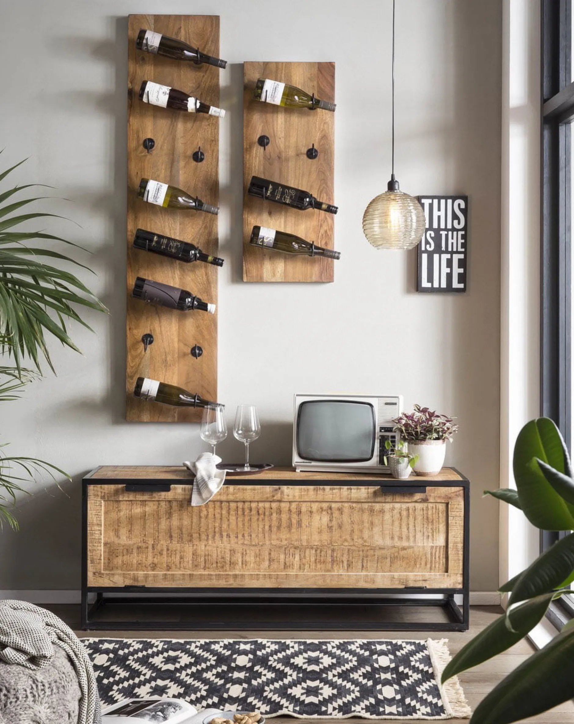 Het Wijnrek Indus combineert een praktisch ontwerp met een sfeervolle uitstraling. Dit wandrek biedt ruimte voor 4 wijnflessen en kan eenvoudig worden gecombineerd met meerdere rekken voor een speelse indeling. Het robuuste mangohout en de metalen haken in antieke afwerking zorgen voor een rustieke look.